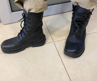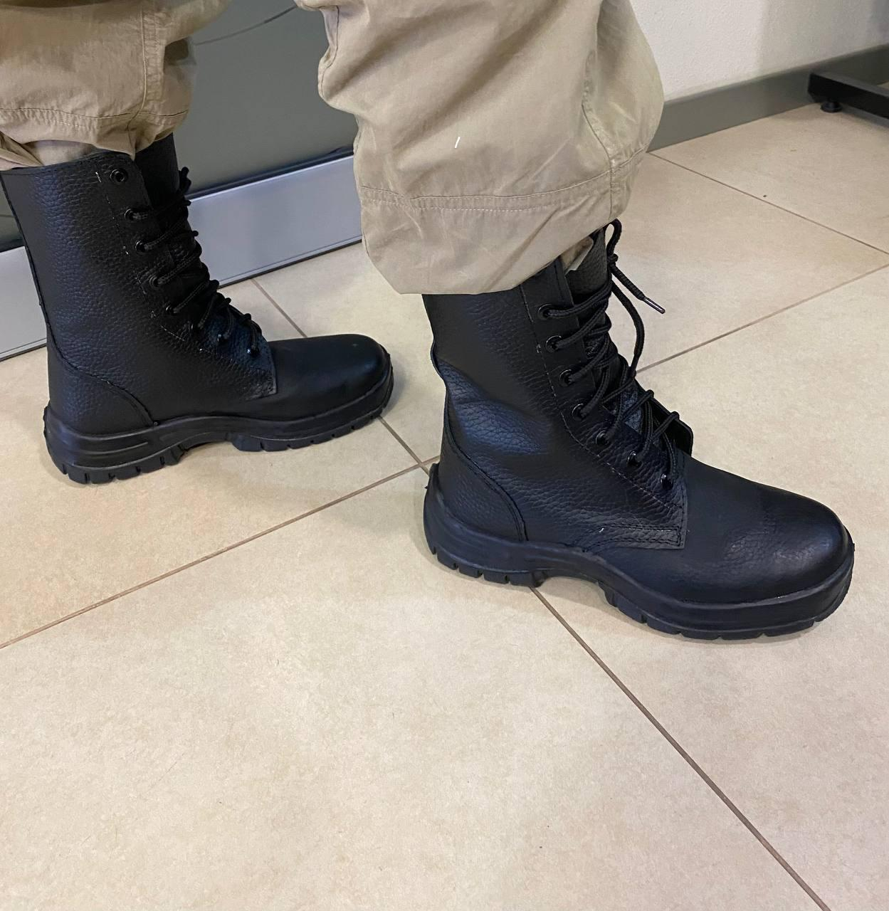Черевики з високими берцями демісезонні, з натуральної шкіри , з настрочними берцями, з глухим клапаном, на шнурках. Підкладка з ХБ матеріалу, вставна устілка з матеріалу ЕВА. Жорсткий задник , термопластичний підносок (товщ. 2 мм). Підошва з поліуретану підвищеної зносостійкості, з властивостями МБС. t експлуатації — 15 +90 С. Розмірний ряд 36-47.