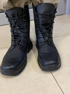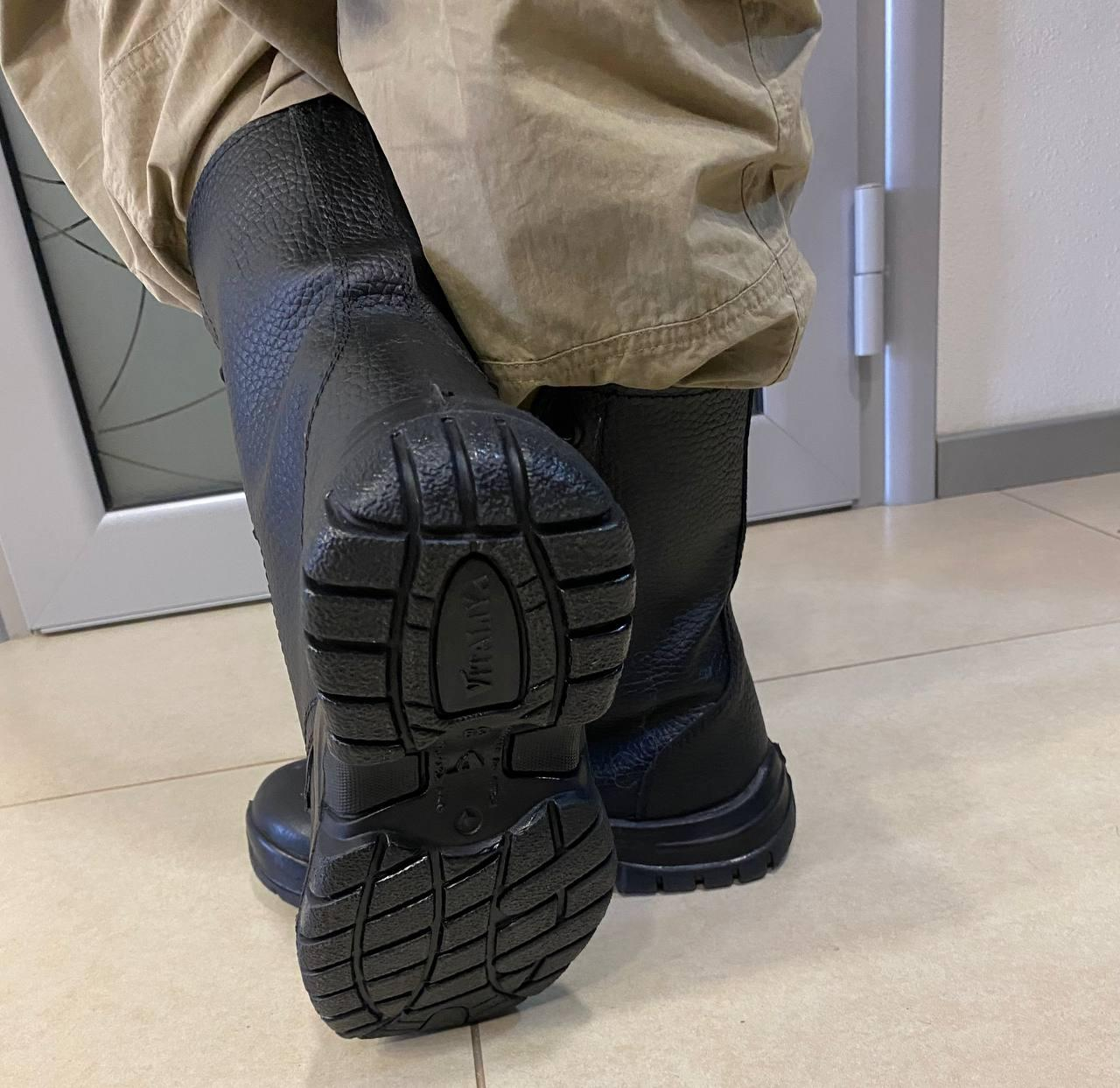 Черевики з високими берцями демісезонні . з натуральної шкіри , з настрочними берцями, з глухим клапаном, на шнурках. Підкладка з ХБ матеріалу, вставна устілка з матеріалу ЕВА. Жорсткий задник , термопластичний підносок (товщ. 2 мм). Підошва з поліуретану підвищеної зносостійкості, з властивостями МБС. t експлуатації — 15 +90 С.