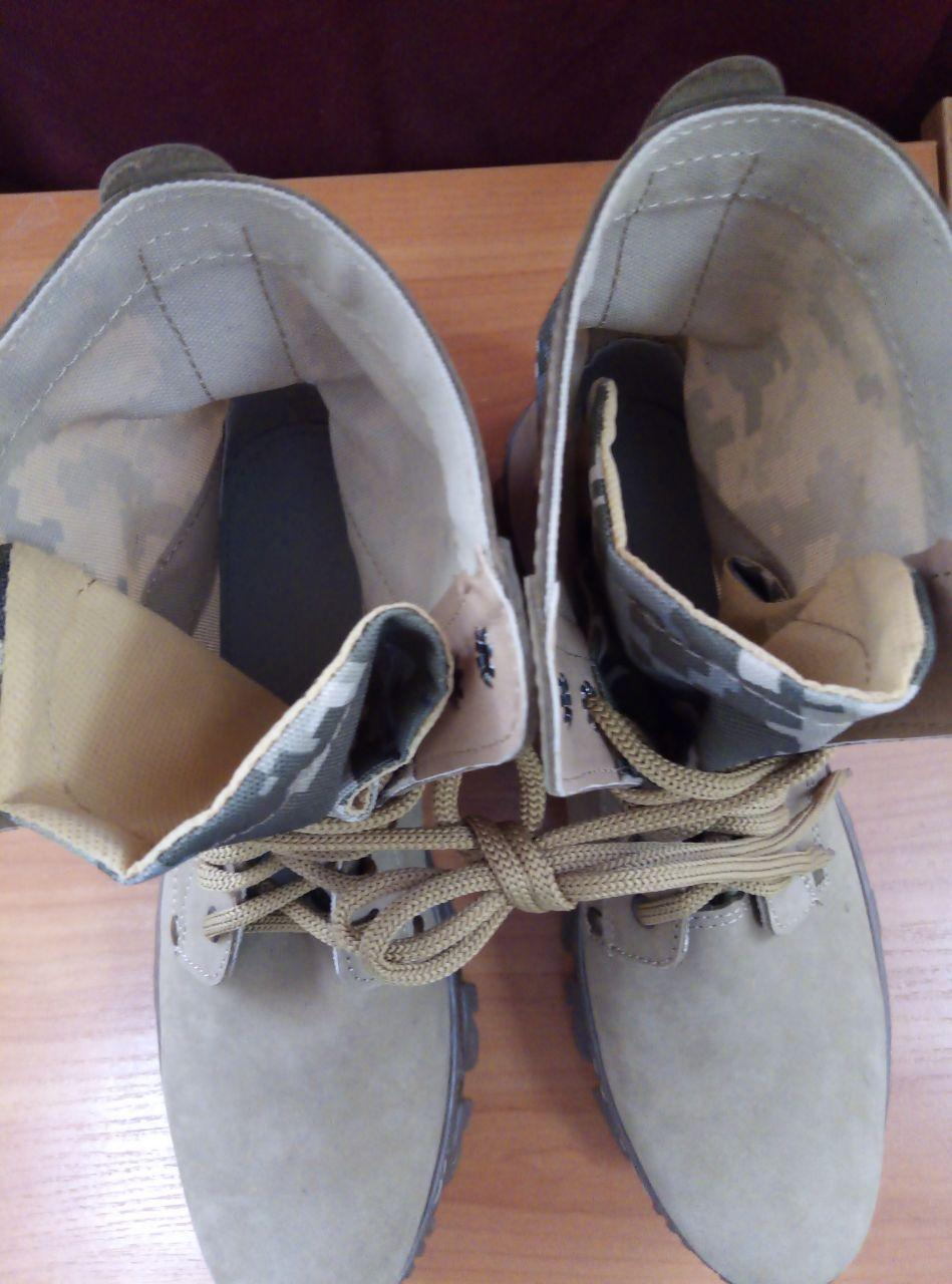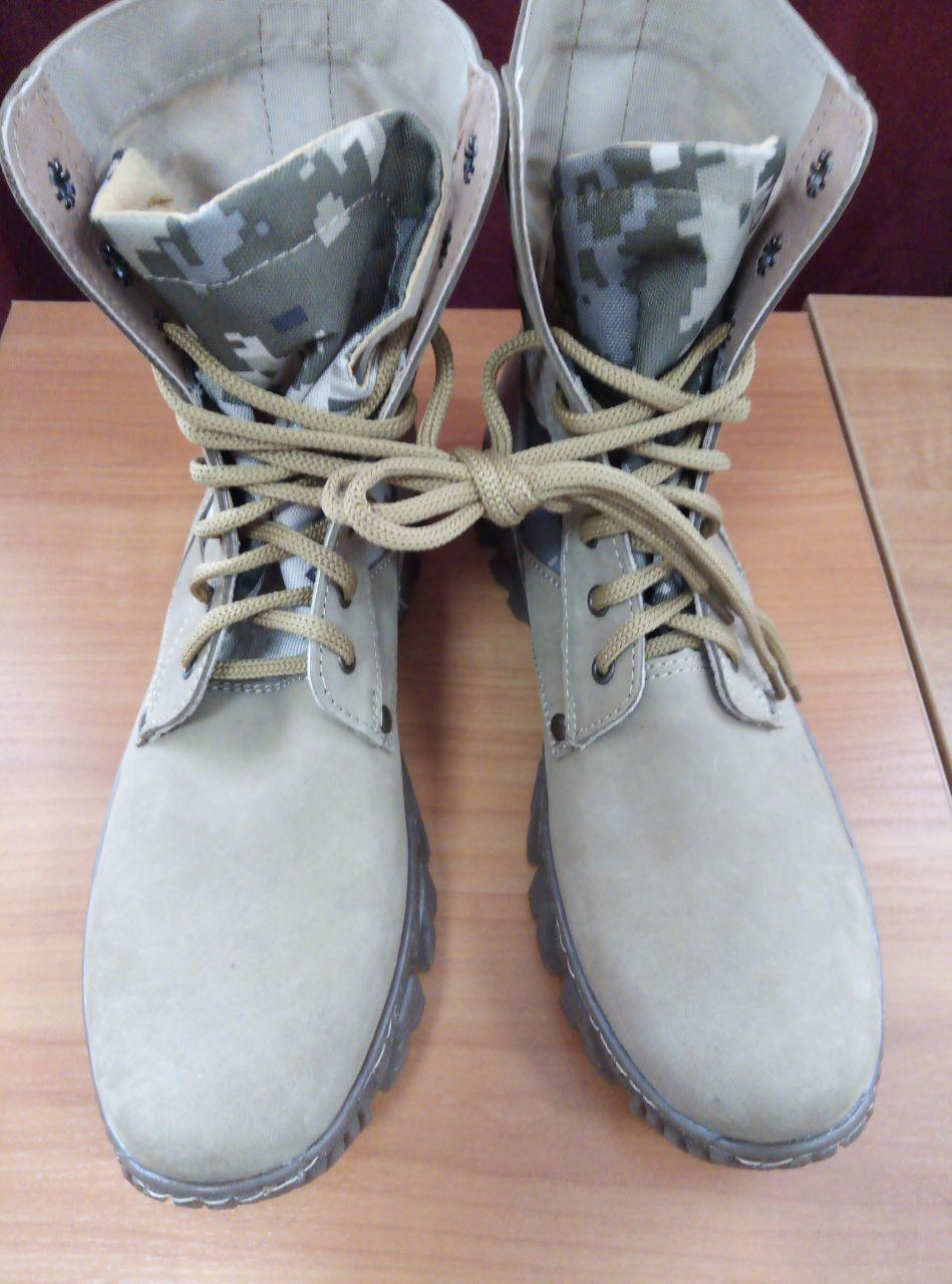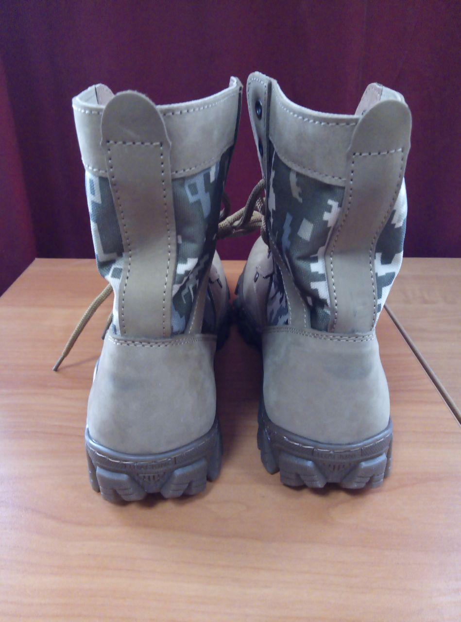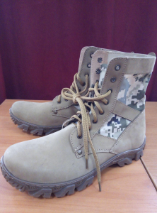 Берці літні на шнуровці. Підошва ПУ, клеєпррошивний метод кріплення. Верх - шкіра крейзі з водовідштовхуючим просоченням ,за рахунок обробки воском. Укріплений носок та задник. Висота 20 см. Колір - світлий беж. Вставки -кордура з ВВ просоченням, піксель. Текстильна бавовняна підкладка. Розміри 40-46. Виготовлення під замовлення, протягом 7-10 днів.