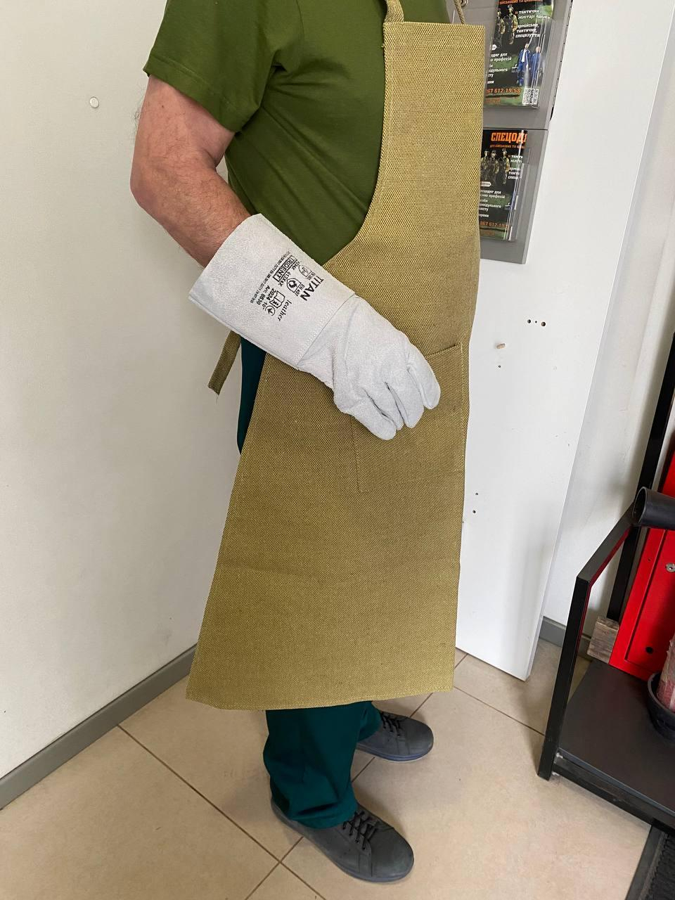 Фартух із нагрудником з міцного ВУГНЕУПЕРНОГО БРЕЗЕНТА, , щільн. 480 гм2, використовується для роботи на гарячих виробництвах, зокрема для захисту зварника від іскор і бризок розпеченого металу, або для захисту робочого одягу від стирання та механічних пошкоджень. Довжина виробу 94 см. (нижче коліна).Ширина в поясі 56 см, ширина по нижньому краю 89 см. Праворуч є бічна кишеня. Колір ХАКИ.