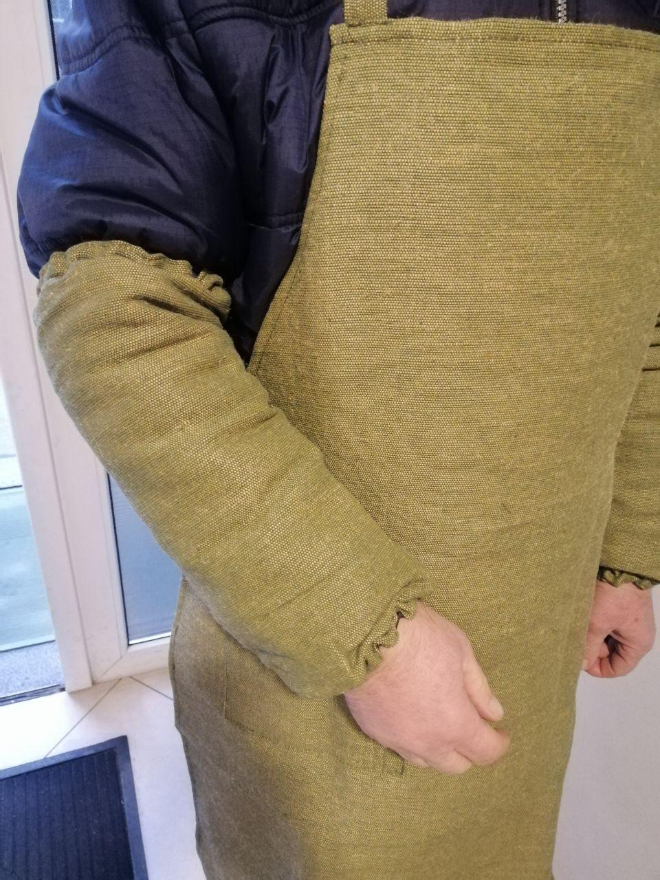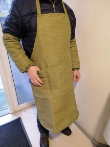 Фартух з нагрудником з ВОГНЕТРИВКОЇ ПАРУСИНИ , щільн. 420 гм2, використовується для робіт на гарячих виробництвах, зокрема для захисту зварювальника від іскор та бризок розкаленого металу, або для захисту робочого одягу від тертя та механічних пошкоджень. Довжина виробу 93 см (ниже колін). Ширина в поясі 60 см, ширина по нижньому краю 80 см. Є одна бокова кишеня. Колір ХАКІ.