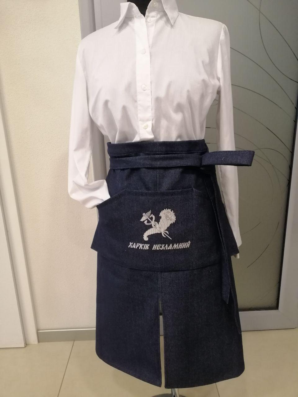 Фартух ДЖІНСОВИЙ для офіціанта, з вишивкою "ХАРКІВ НЕЗЛАМНИЙ"