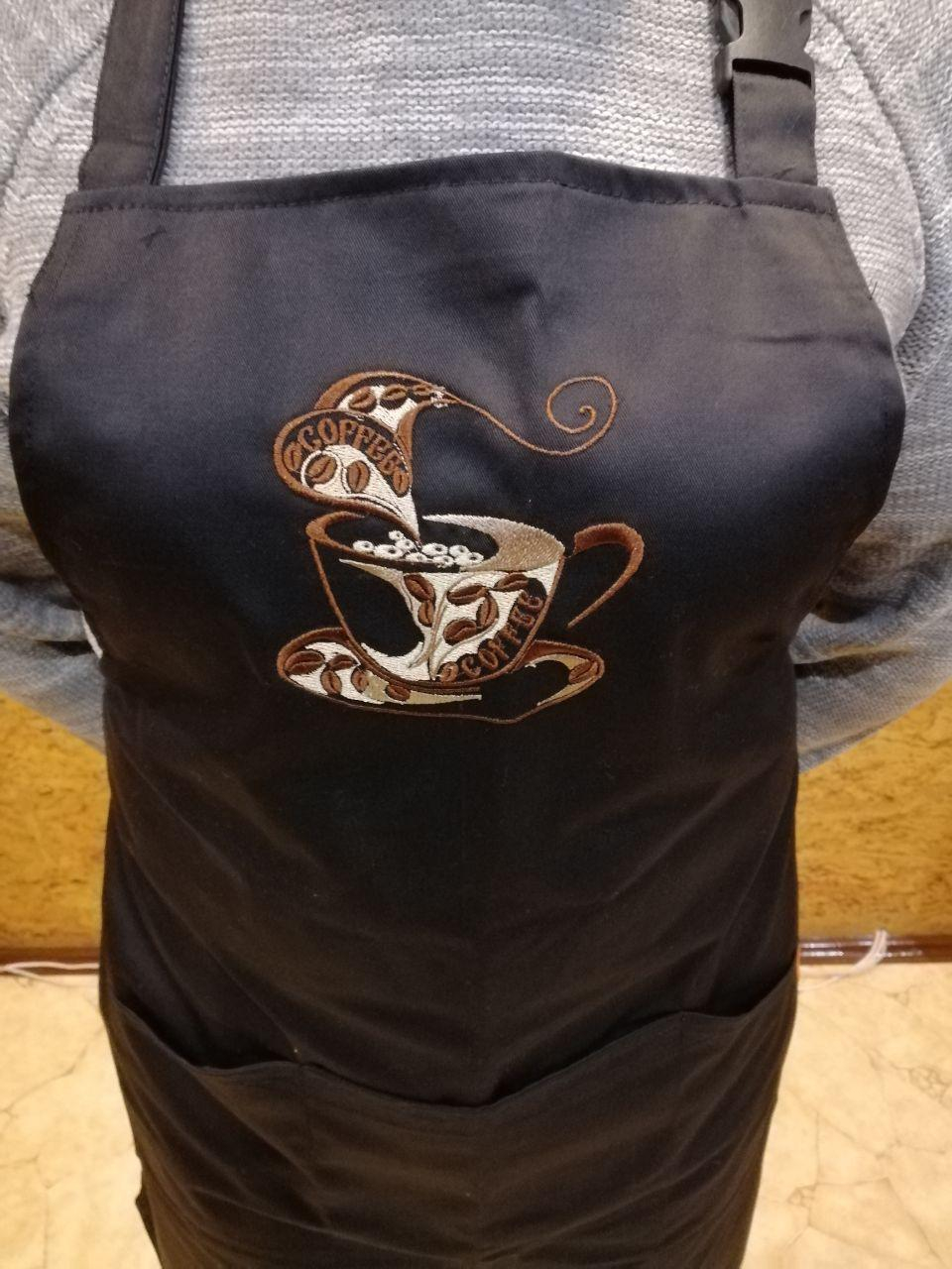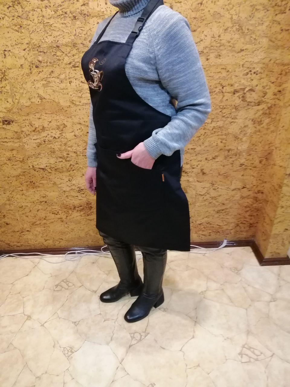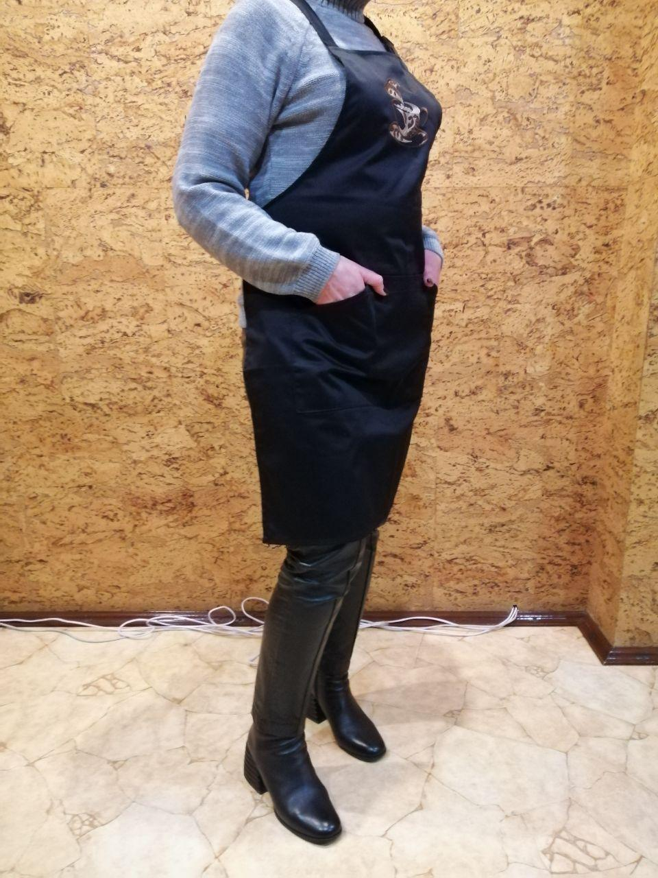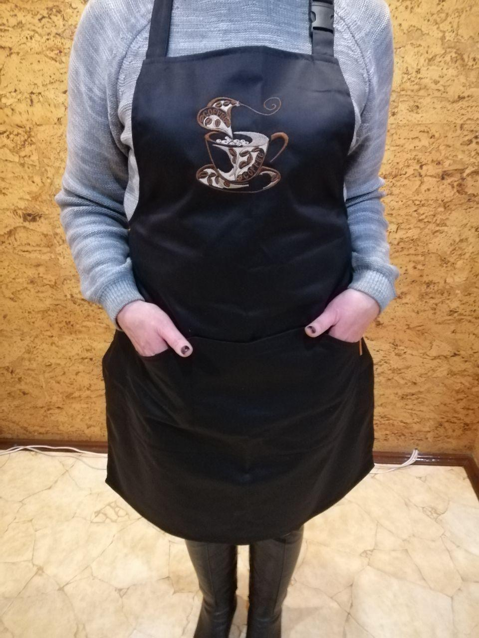 Стильний чорний фартух із нагрудником для кухаря, офіціанта або домогосподині, виготовлений з щільної чорної змішаної тканини (склад 65%пe/35%хб). Попереду є велика об'ємна кишеня на три відділення. Довжина фартуха 87 см, ширина 68, довжина зав'язок 68 см. Довжина шлейки регулюється за допомогою карабіна. На нагруднику фартуха зроблена вишивка ЧАШКА КАВИ.