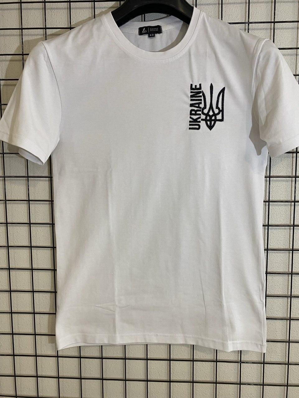 Футболка бавовн (жін/чол) БІЛА з вишивкою UKRAINE+Тризуб р.XS, S, M, L