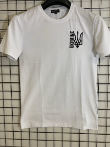 Щільна біла футболка з короткими рукавами відмінної якості. Склад : 95%бав/5%еластан., щільн. 200 гм2. Горловина кругла. Посилююча тасьма по вороту від плеча до плеча зберігає форму виробу, запобігає його розтягуванню. З боковими швами. На грудях ліворуч розташована вишивка UKRAINE+Тризуб , колір чорний.
