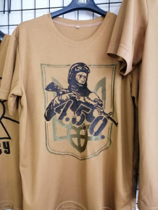 Футболка чоловіча з коротким рукавом. Має анатомічний крій (приталена) . Виготовлена з тканини з повітропроникною основою CoolMax — синтетичний матеріал, спеціально розроблений для тактичного одягу в літню пору року, що швидко сохне потовідвідний, стійкий до запаху. Чудово продувається і відводить вологу, за структурою схожий на дрібну сітку. Склад 100% пе, пл.160 гм2. На грудях методом ВИШИВКИ, виготовлений малюнок ВОЇНА та 4. 5. 0. на фоні тризуба.