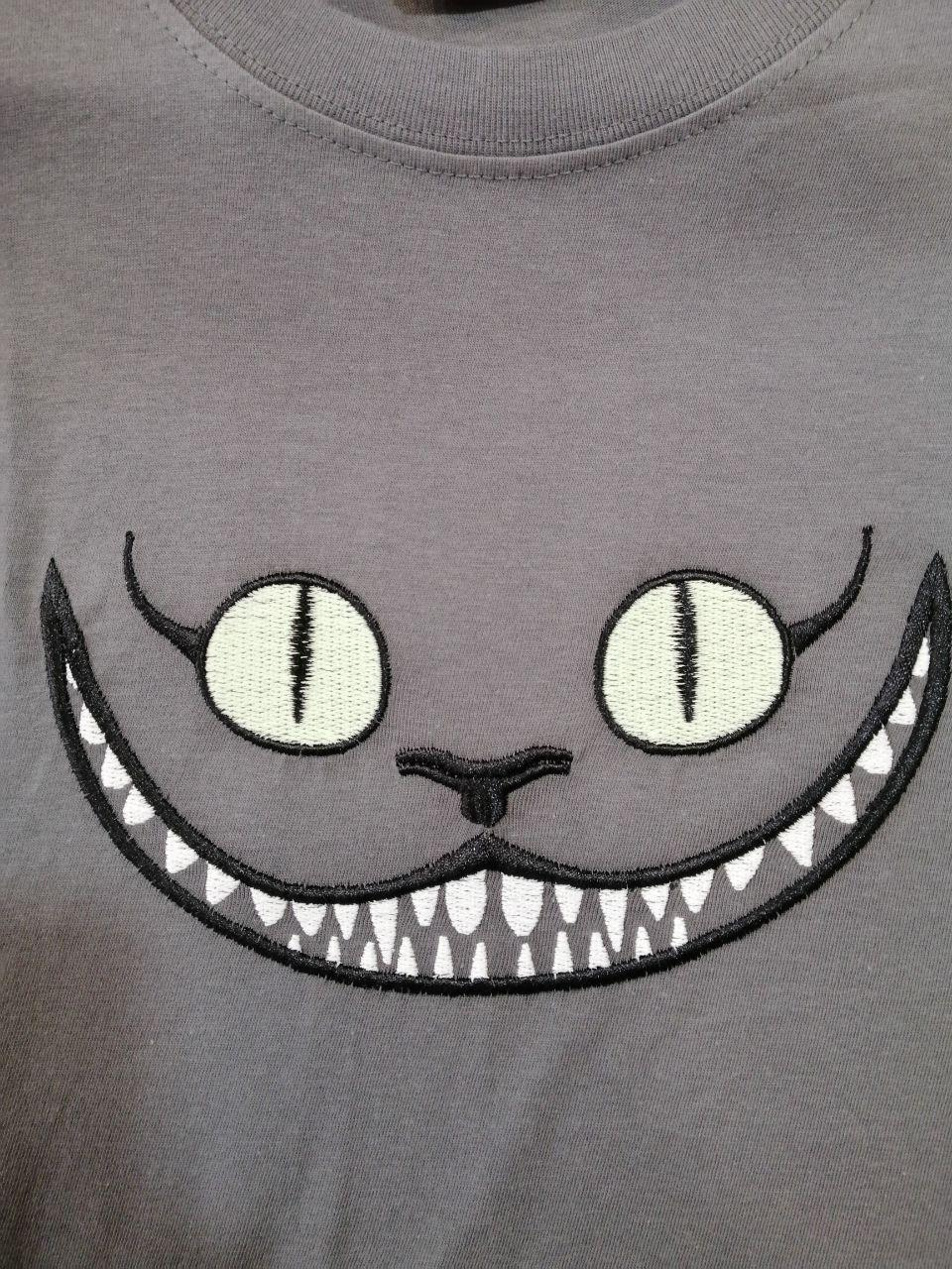 Футболка з коротким рукавом. 100% хб (85%бавовна/15%віскоза) , щільність 155 гм2. Горловина кругла. По вороту , від плеча до плеча, пришита посилююча тасьма, що зберігає форму виробу, не дає розтягнутися. Без бокових швів. На грудях вишивка світловідбиваючими нитками ПОСМІШКА ЧЕШИРСЬКОГО КОТА.