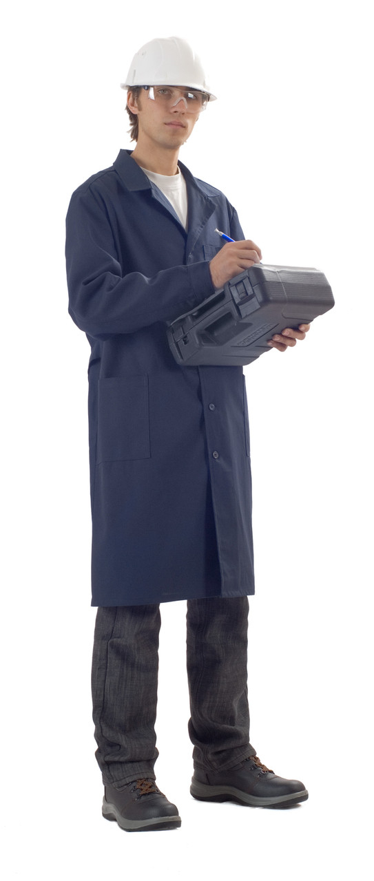 Халат ХБ чоловічий із довгим рукавом призначений для захисту від загальних виробничих забруднень працівників різних галузей і сфер виробництва. Комір — відкладний, рукав довгий із манжетою на ґудзику. Є 2 нижні бічні кишені й одна нагрудна кишеня зліва. У бічних швах розміщений хлястик для регулювання ширини халата по спинці. Виріб виготовлений з ткани Діагональ темно-синього кольору, 100% бавовна, щільний. 230 гм2 . Халат у невеликому розмірі ідеально підійде учням шкіл або інших навчальних закладів для уроків праці або виробничої практики.