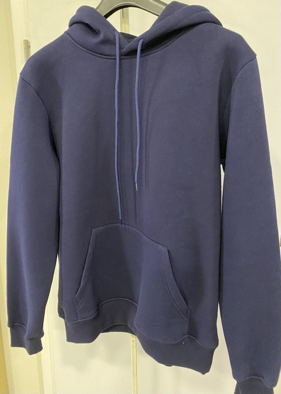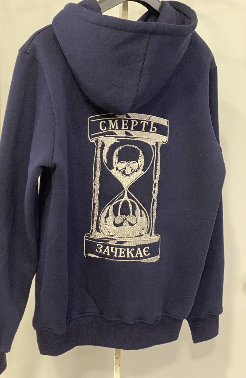 Худі ТЕМНО-СИНЬОГО кольору ,склад 80% бав/20%пе. На спині методом вишивки нанесено малюнок СМЕРТЬ ЗАЧЕКАЄ світло-сірого кольору.