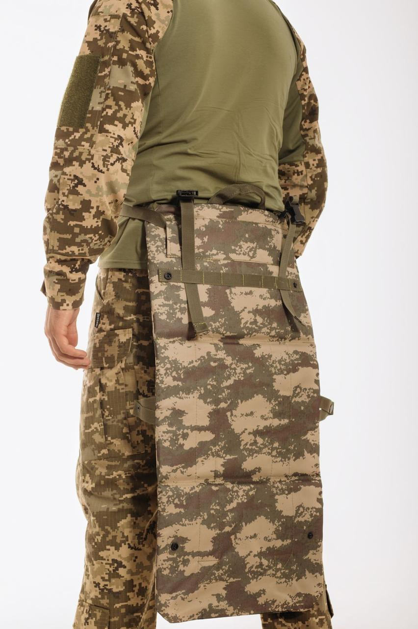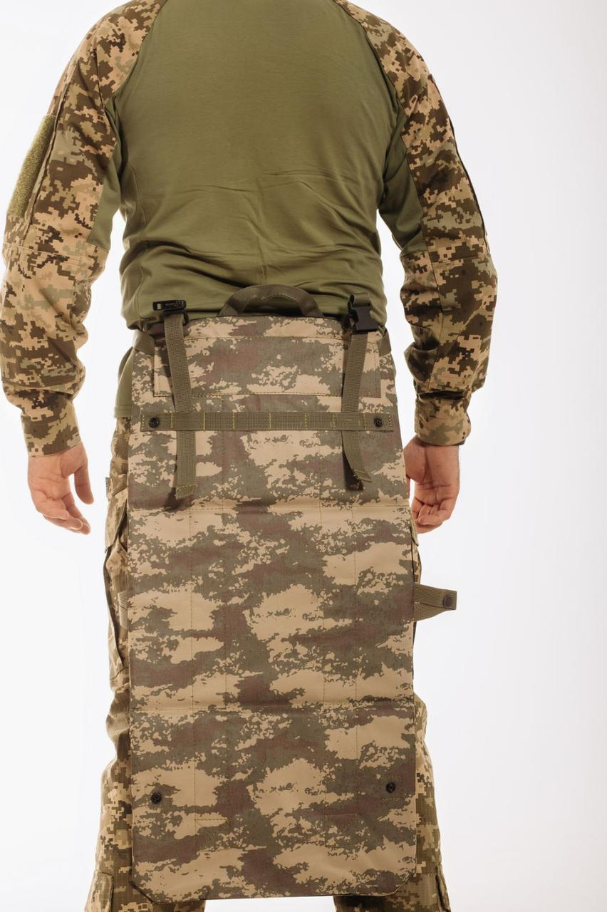 Килимок-трансформер або стрілецький мат носиться позаду на поясі брюк та використовується як сидушка. В розібраному вигляді -як позиція для стрільби, каремат, тощо. Складається з 3-х секцій. Розмір 75х35 см. Товщина ізолону 8 мм. В складеному вигляді фіксується за допомогою карабіна.