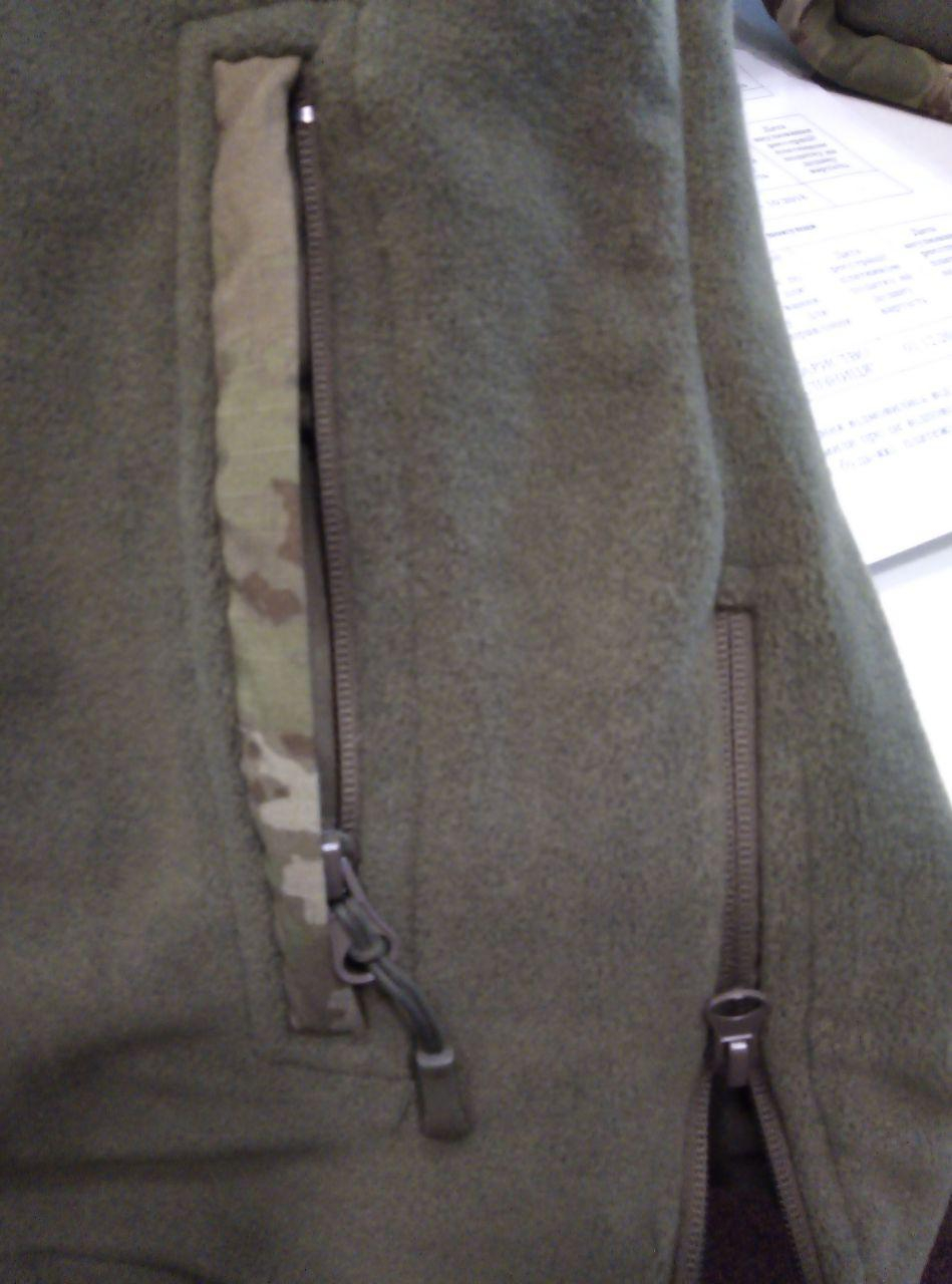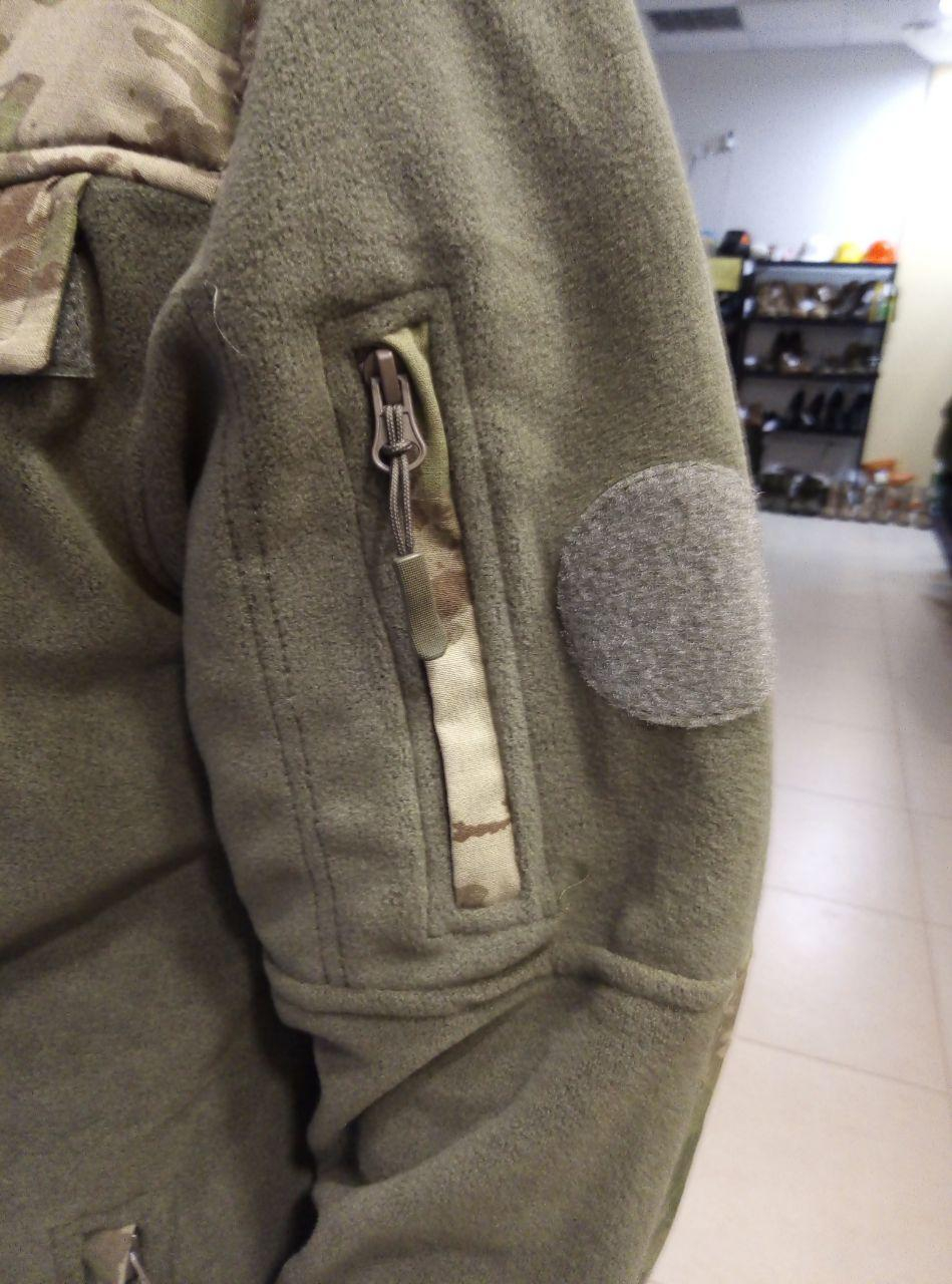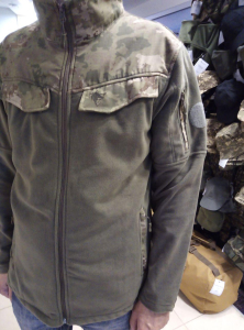Кофта флісова  , сезон весна-осінь. Тканина: фліс, цв. ХАКИ . Відрізна кокетка, комір-стійка, смак рукава, клапани кишень — з оздоблювальної тканини РІП-СТОП, рис. Мультикам. Состав 100% пэ, пл.280 гм2.  Комір-стійка  .  Застібка на блискавку.. Є 2 врізні бічні кишені на блискавці та  один на лівому рукаві, а також внутрішні нагрудні  кишені, закриті клапанами на липучці. Рукав прямий. На обох рукавах  - панель велкро для шевронів. У бічних швах є блискавки. На внутрішній частині пілочок пришита підкладка з м'якої сітчастої тканини.