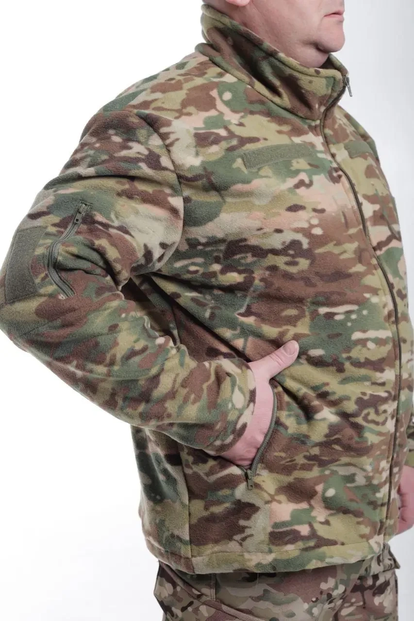Куртка флісова , сезон весна-осінь. Тканина: фліс, рис. МУЛЬТИКАМ.Склад 100% пе, пл.280 гм2. Комір-стійка . Застібка на блискавку.. Є 2 врізні бічні кишені на блискавці та на обох рукавах. Рукав прямий, без манжети. На двох рукавів і на грудях, зліва та праворуч, - панель велкро для шевронів. Ширина по низу регулюється шнуром із фіксатором.