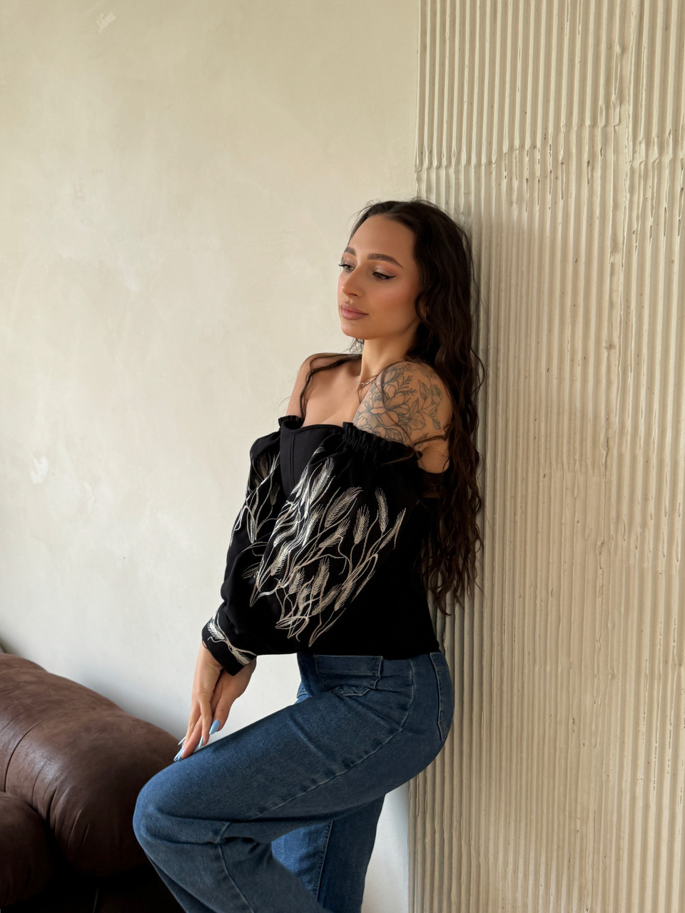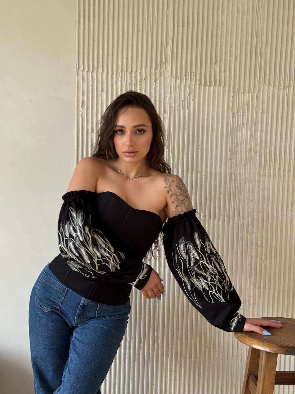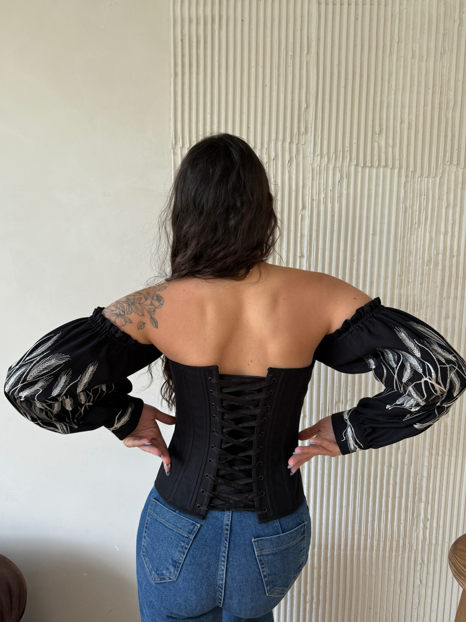 Корсет — вишиванка з рукавами, чорний, з вишивкою "КОЛОСКИ" р. M