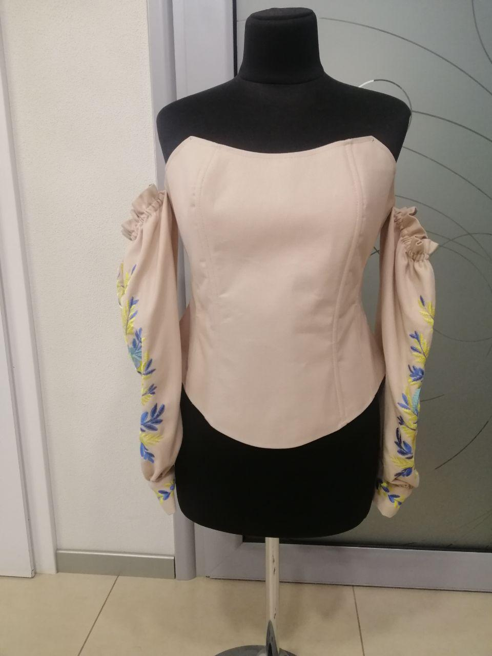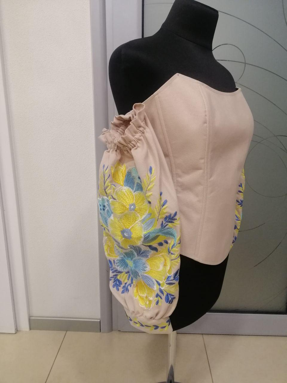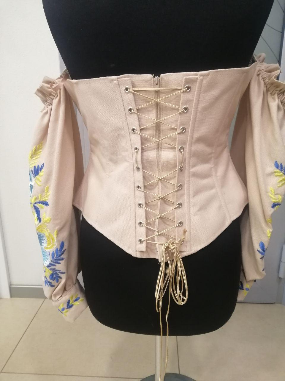 Корсет — вишуканий елемент жіночого гардероба, підійде як для урочистого випадку, так і в повсякденному житті. Вишиванка-корсет із довгими рукавами має прекрасний вигляд у поєднанні з спідницею, штанами або шортами. Шнурівка на спині надає особливої елегантності та візуально створює ідеальну фігуру. Корсет виготовлений з домотканого полотна кольору кави з молоком на шовковій підкладці. Рельєфні шви прекрасно тримають форму завдяки "Каповому вусу" (кісточки). Рукави та манжети корсета прикрашені вишивкою "ТФІАЛКИ" .По спинці корсет застібається на "блискавку".