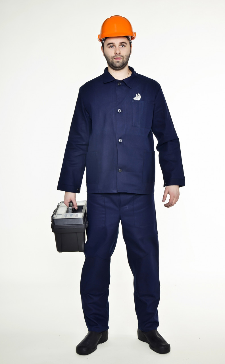 Костюм ( куртка+штани) для захисту від механічних забрудень і тертя виконаний з сумішевої тканини. Склад 80% пе/ 20% бав., щільн. 210 гм2, колір темно-синій. Куртка з відкладним коміром. Гульфік штанів на гудзиках. Рукав з манжетою на гудзику. Кишені куртки накладні ( 2 бокові і 1 нагрудна) та дві внутрішні на брюках. В силу НЕВЕЛИКОГО зросту ( 158-164 см) костюм ідеально підійде в якості ЖІНОЧОГО спецодягу