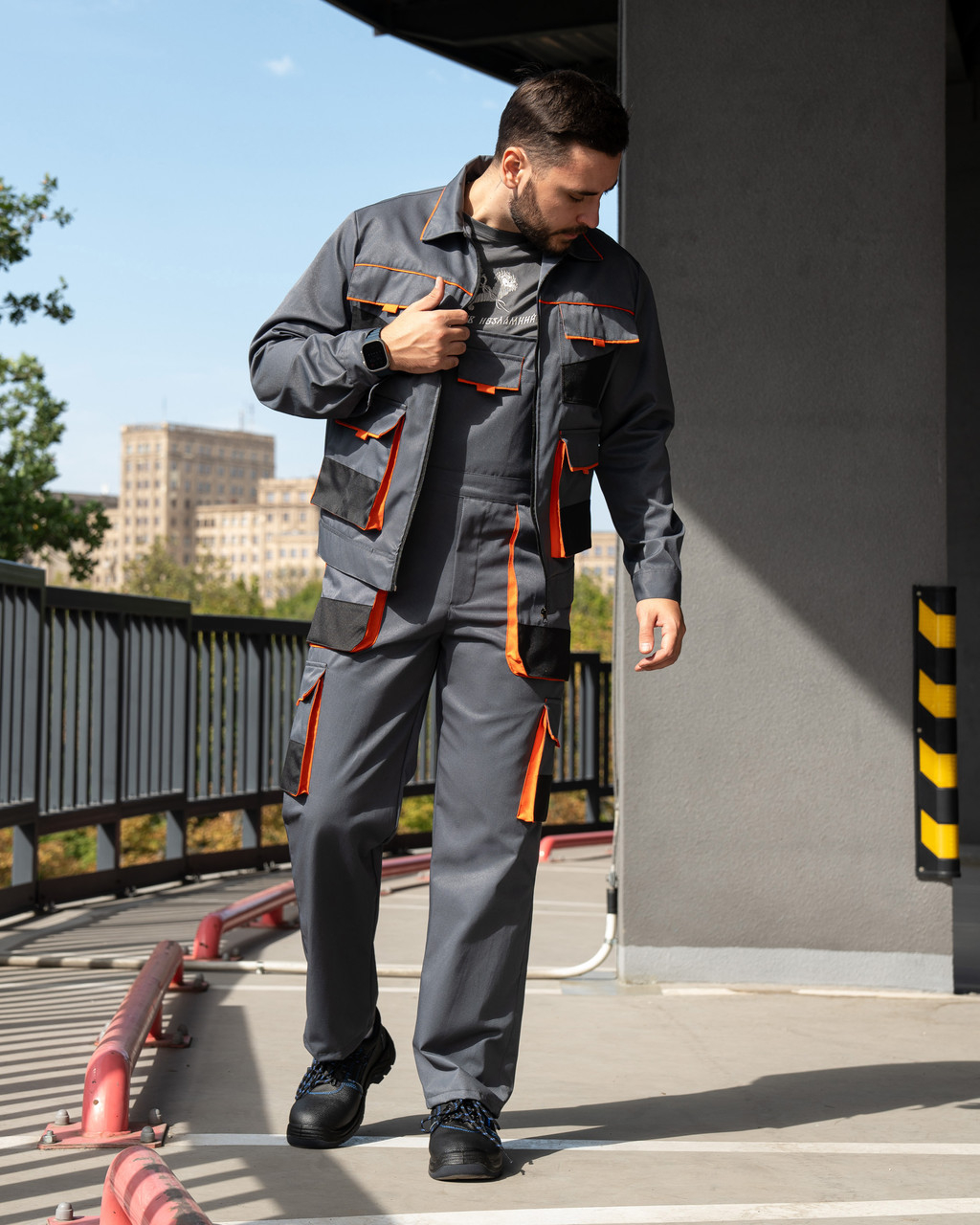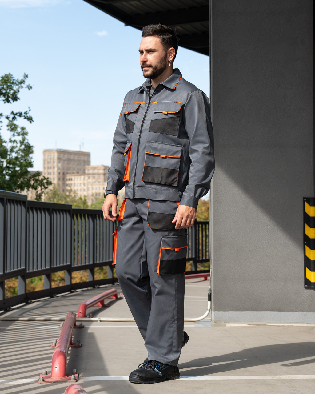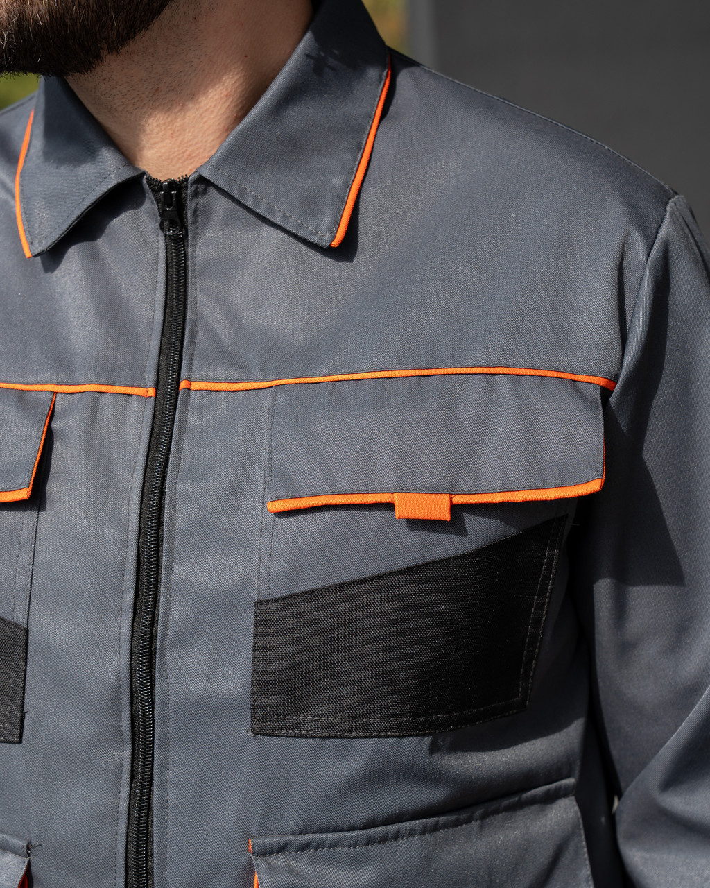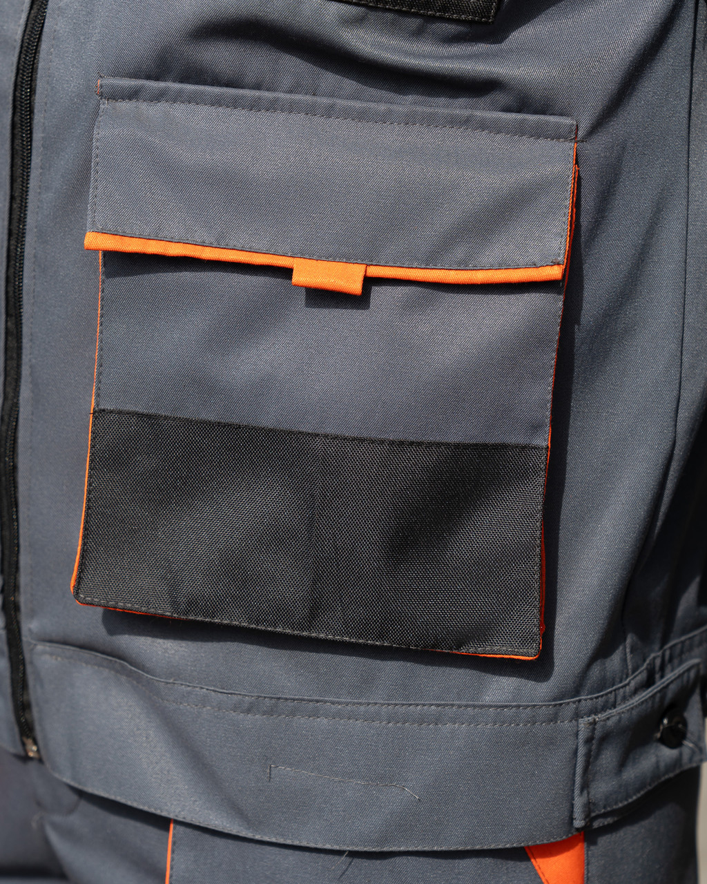 Комбінований робочий костюм  стане в  нагоді чудовим спецодягом для робітників багатьох сфер виробництва, сільського господарства, автосервісу.  Костюм має безліч об,ємних кишень з клапанами на липучках. Нижні частини кишень ПОСИЛЕНІ додатковими накладками з міцної, виносливої до стирання тканини Оксфорд. Куртка застібається на блискавку. Комір відкладний.  Пояс куртки по боках регулюєтся за допомогою пат. Костюм пошитий з сумішевої тканини Грета ( 53%бав/47%пе), щільн. 220 гм2.