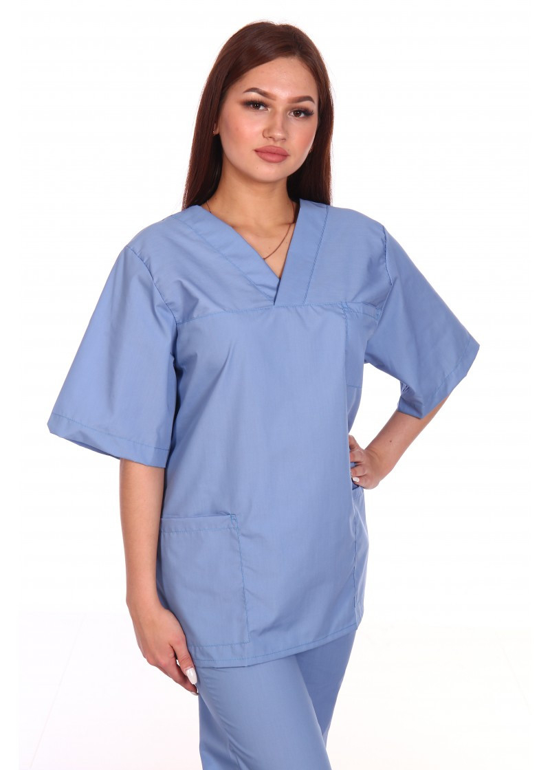 Костюм вільного крою з коротким рукавом для медпрацівників, працівників харчових, фармацевтичних галузей і чистих виробництв. Виріз горловини V-подібний. Є 2 бічні й одна нагрудна кишеня. Пояс штанів на гумці та шнурку. Тканина сорочкової групи, склад 35%хб/65%pe, щільн.165 гм2. Костюм може комплектуватися з шапочкою.