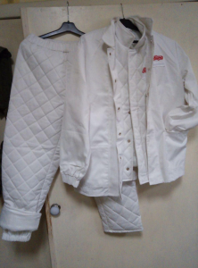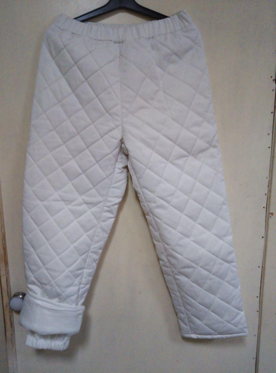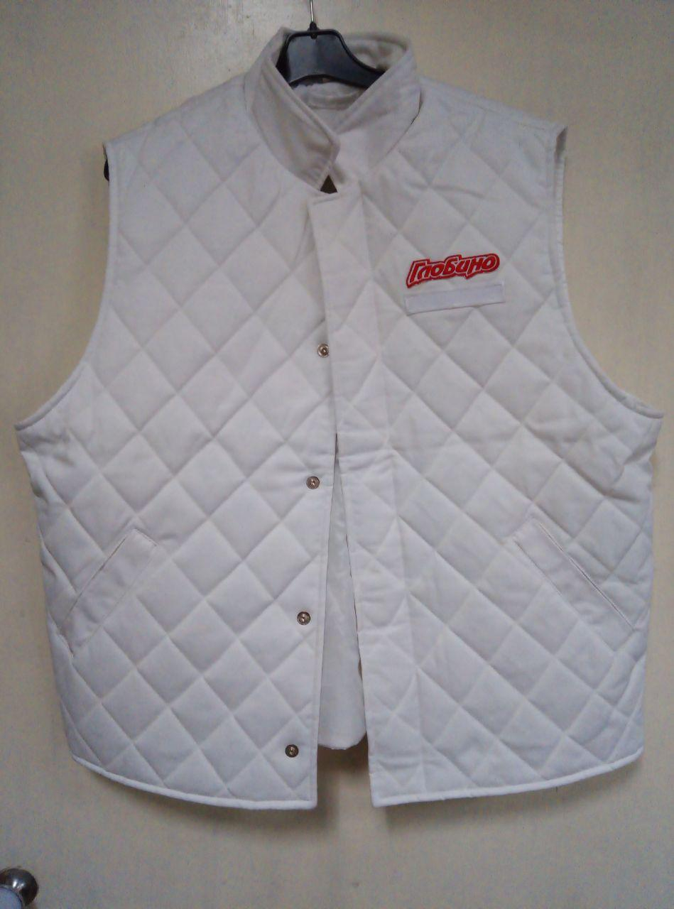 Костюм утеплений "трійка" складається з : Штанів утеплених стеганих + жилета утепленого стеганого + куртки неутепленої. Тканини ГРЕТА, склад 53%бав\47%пе, утеплювач : синтепон 200гм2. Колір БІЛИЙ. Костюм призначений для носіння в чистих холодних приміщеннях (напр. молокозавод, м'ясокомбінат, тощо). Штани мають напульсник з флісу. Спідня частина комірця жилета теж флісова. Застібка жилета і куртки -кнопки. На курточці вони закриті супатом. Манжети куртки на різинці.
