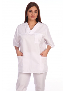 Костюм вільного крою з коротким рукавом для медпрацівників, працівників харчових, фармацевтичних галузей і чистих виробництв. Виріз горловини V-подібний. Є 2 бічні кишені Пояс штанів на гумці та шнурку.  Тканина сорочкової групи, склад 35%бав65%пе, щільн. 165 гм2. Костюм можна комплектувати шапочкою.