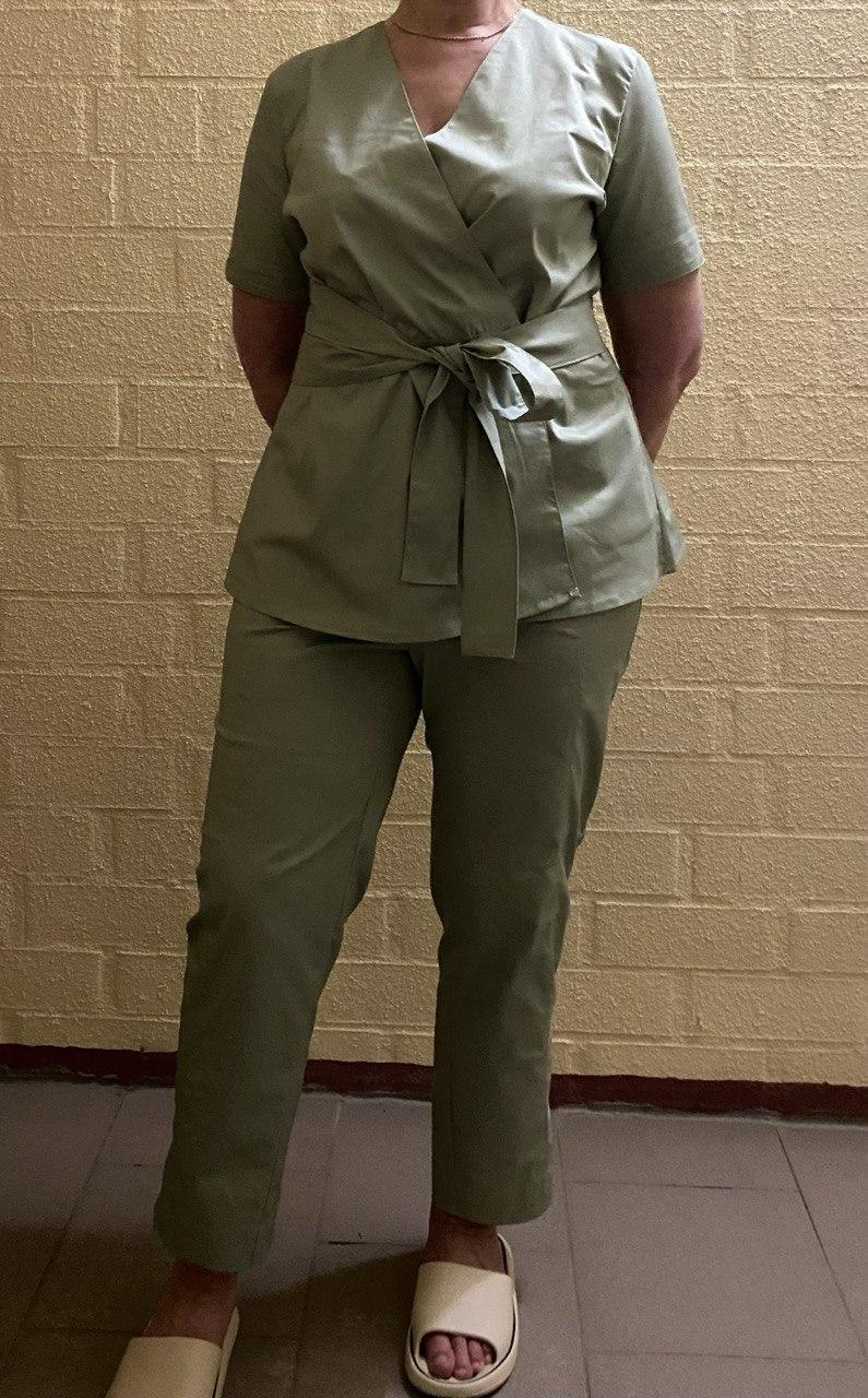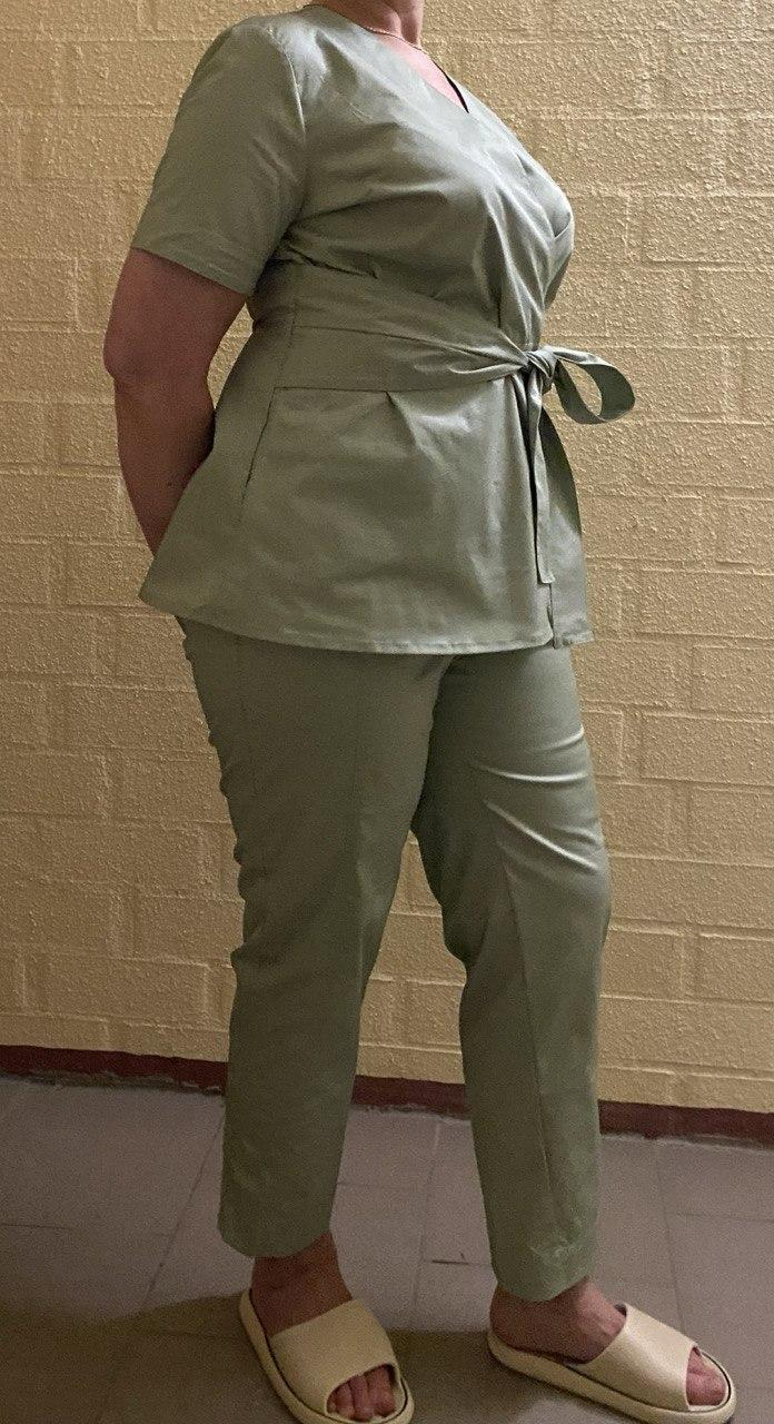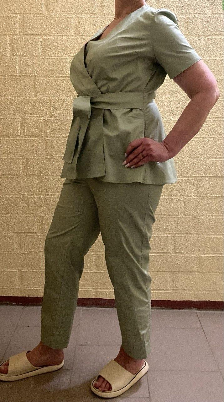Костюм жіночий з короткими рукавами. Використовується як уніформа для медпрацівників ,фармацевтів, косметологів. V-подібний виріз горловини. Куртка з запахомЮ застібка на два гудзики + напівпояси з бокових швів. Є дві внутрішні бокові кишені в бокових швах. Штани вільного крою з поясом на резинці.Брючини не цільнокроєні, а складаються з кількох деталей, поєднаних рельєфними швами. Між боковим і центральним рельєфним швом розташовані внутрішні кишені. . Тканина халатної групи, стрейчева . Склад 35% бав\63%пэ\е+2%спандекс, щільн.165 гм2. Колір СВІТЛА ФІСТАШКА.