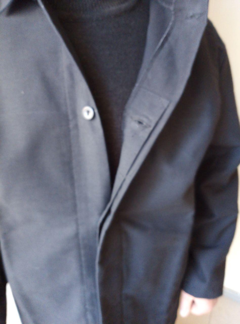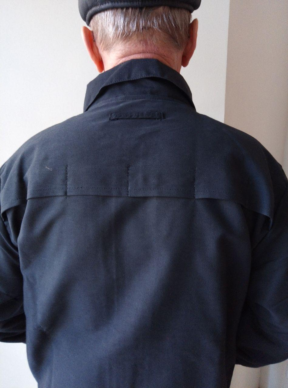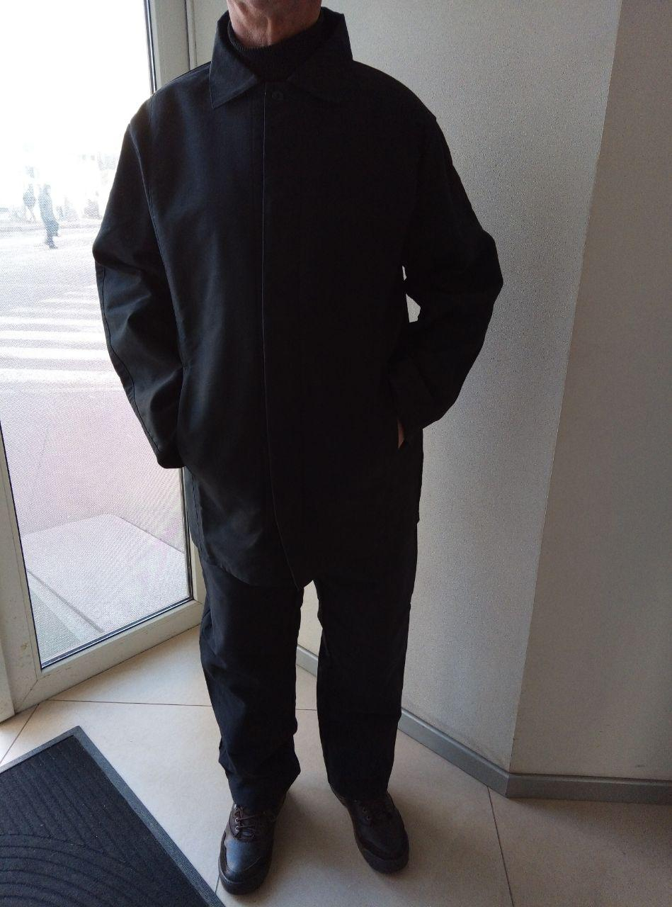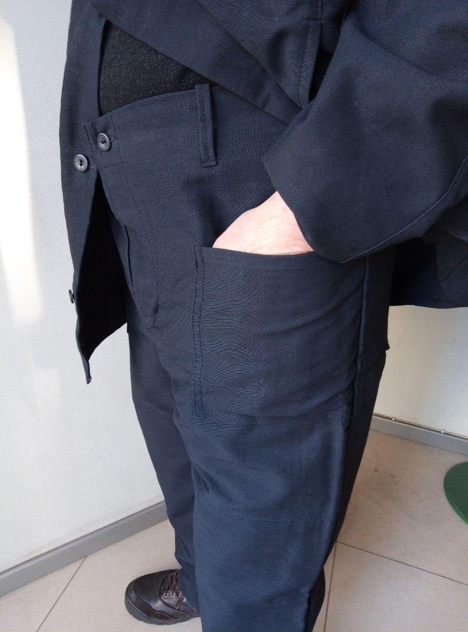 Костюм (куртка + штани) для зварника, виготовлений з особливо міцної бавовняної тканини сатинового плетіння МОЛЕСКІН, з вогнестійким просоченням. Склад 100% бавовна, щільний. 280 гм2, колір чорний..Куртка з відкладним коміром і  супатній  застібкою на ґудзики. Посилені накладки розташовані по поличках зверху до низу;  по передній частині  рукавів від плеча до низу та  на штанинах спереду від зони вище коліна та до нижнього краю. Гульфик штанів на ґудзиках.  Кишені на куртці внутрішні, розташовані в вертикальних рельєфних швах. На штанах — 2 накладні бічні кишені.  Рукав прямий, без манжети. Перевагою костюма є  його легкість  , порівнюючи з аналогом із брезенту.