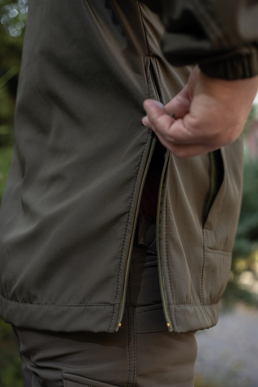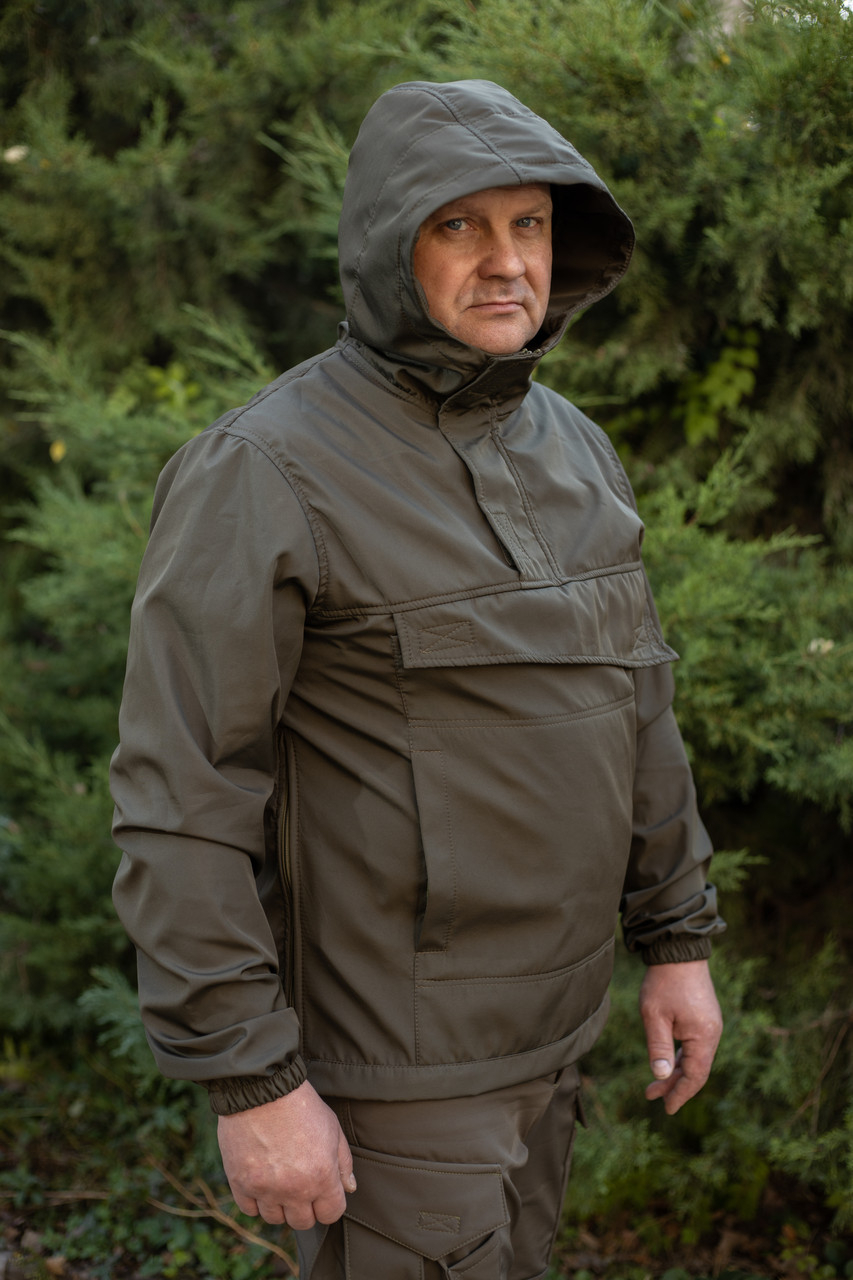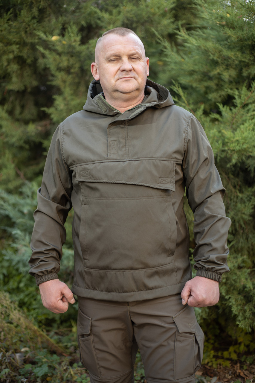 Куртка АНОРАК виготовлена в мілітарі-стилі та призначена для носіння восени або навесні. Вона ідеально підходить як для міста, так і для польових умов. Забезпечує комфорт у прохолодну погоду, невеликий дощ і вітер, завдяки вітро- та вологовідштовхувальній основі і матеріалу зі 100% поліестеру ( мікрофібри) з гарною вентиляцією і швидким висиханням. Конструкція анорака не містить центральної змійки, одягається через голову. У центрі є великий кенгуру-кишеня з клапаном на липучці, для зберігання спорядження, з верхнім входом, і два бічні — для рук і невеликих речей. Рукави куртки на гумці. Бічні шви обладнані застібкою-блискавкою для кращої посадки на фігурі та захисту від негоди. Комір куртки застібається на блискавку, закриту вітрозахисним клапаном.