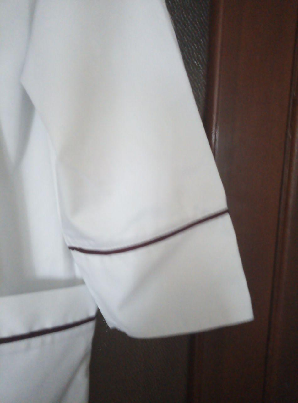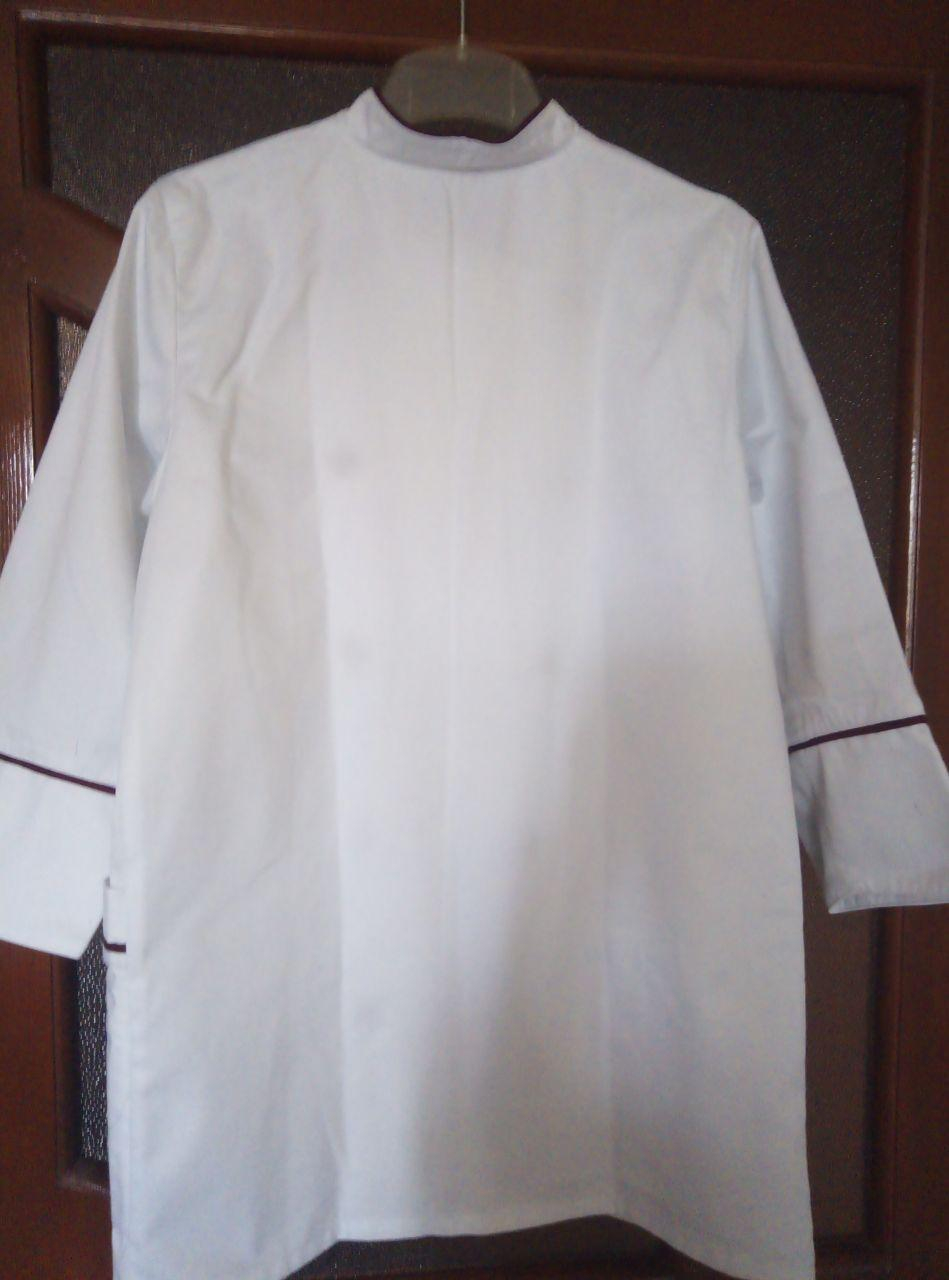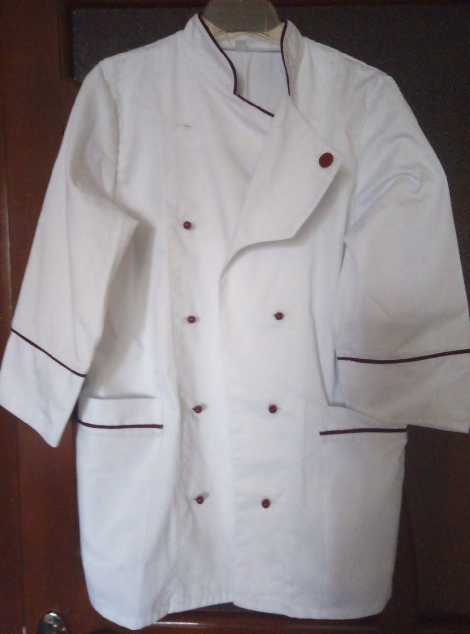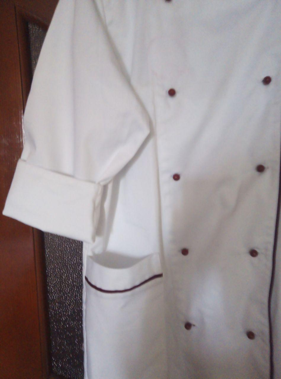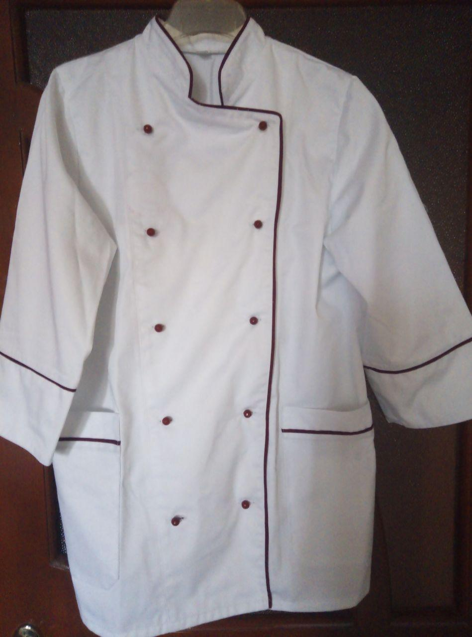 Куртка чоловіча поварська. Колір : біла з відділочним бордовим кантом та гудзиками на ножці. Комір-стійка. Центральна двобортна застібка. Рукава втачені , з відкладним манжетом. Спинка рівна. Тканина щільна, склад 65%пе\35%бав. Розмір 48-50 (170\176).