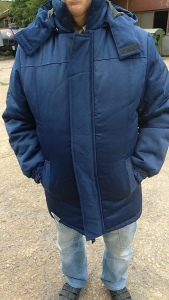 Тканина верха плащова ГРЕТА з водостійким просоченням. Склад,47%пе\53%бав, колір ТЕМНО-СІНІЙ. Утеплювач - синтепон 300 гм2 - спинка, груди. Синтепон 200гм2 - рукава.