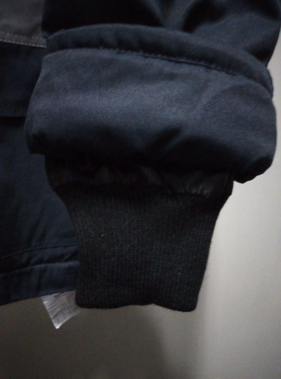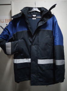 Тканина верху ГРЕТА з ВС просоченням, 47%пе\53%бав, основний колір ТЕМНО-СИНІЙ, відділка -ЕЛЕКТРИК -кокетки (спинка,груди) верхня частина рукавів. Утеплювач -2 шари ватину щільн 370 гм2. Підкладка  флісова (спинка,груди), тканина підкладкова(рукава).