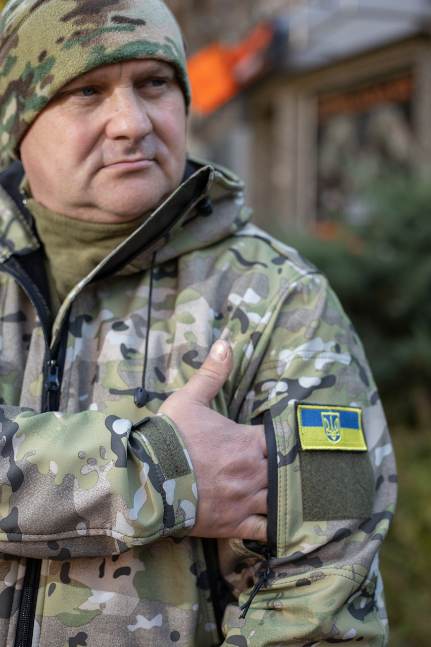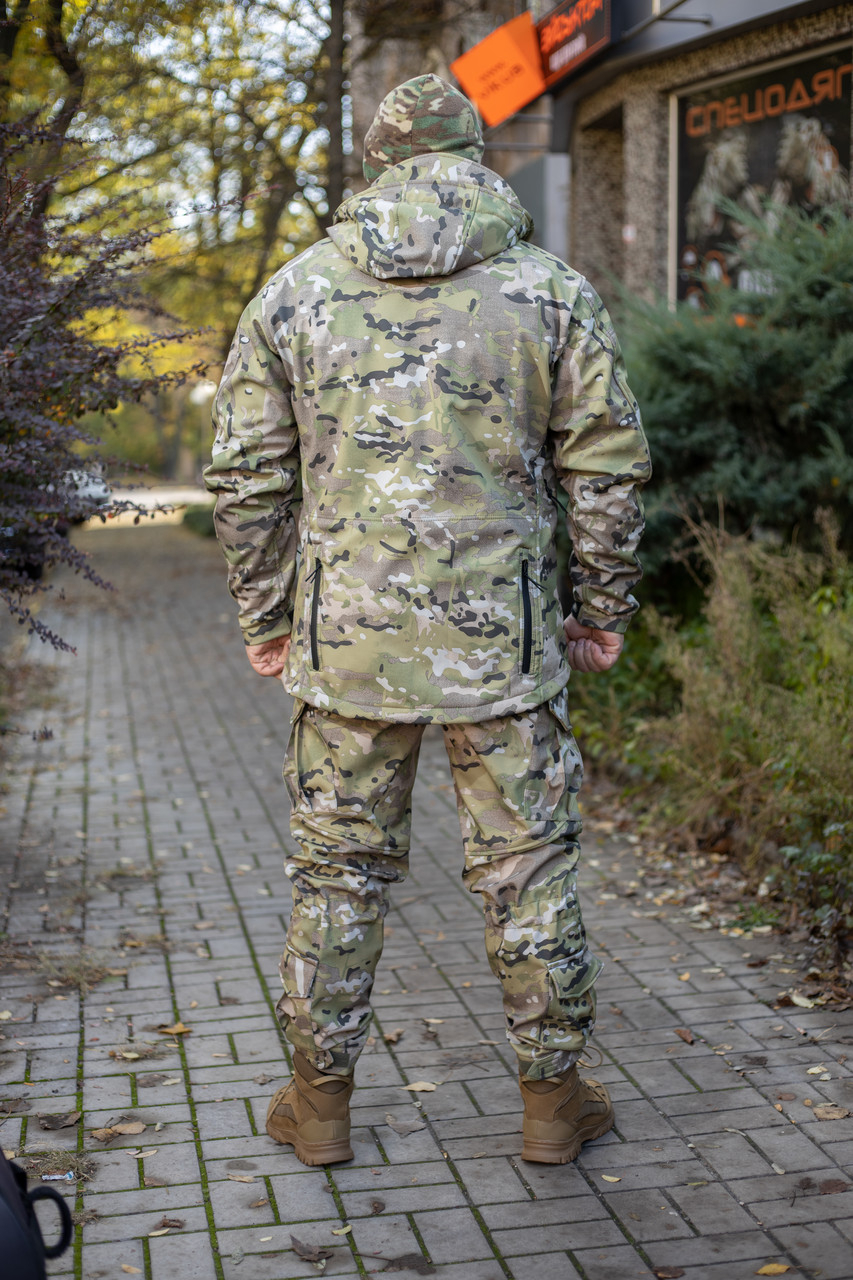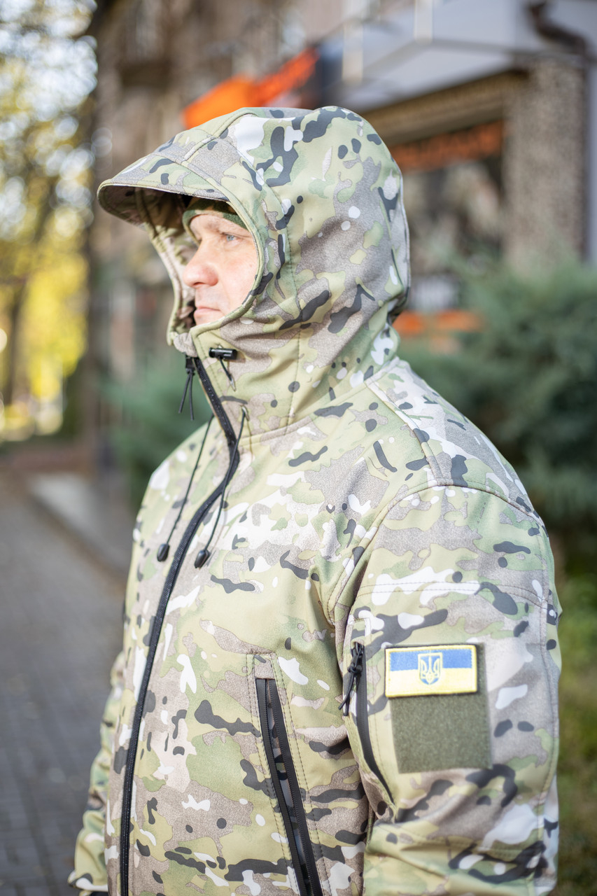 Тактична куртка-штормівка виготовлена зі щільної мембранної тканини Softshell  c  ВО-просоченням і утеплена стьобаною підкладкою на синтепоні пл.100 гм2 Підходить для використання у вологих погодних умовах. Застібається на застібку-блискавку, утворюючи комір-стійку. Об'єм капюшона регулюється за допомогою шнура та фіксаторів. У конструкції капюшона передбачений короткий козирок. Капюшон також утеплений синтепоном. На передній частині розташовані вертикальні кишені на рівні грудей, утеплені флісом. Також кишені є на обох рукавах і на спинці куртки в поперековій зоні. Ширина рукава регулюється патою на липучці. На рукавах є панелі велкро для шевронів. У комплекті зі штанами з такої ж тканини утворює костюм.