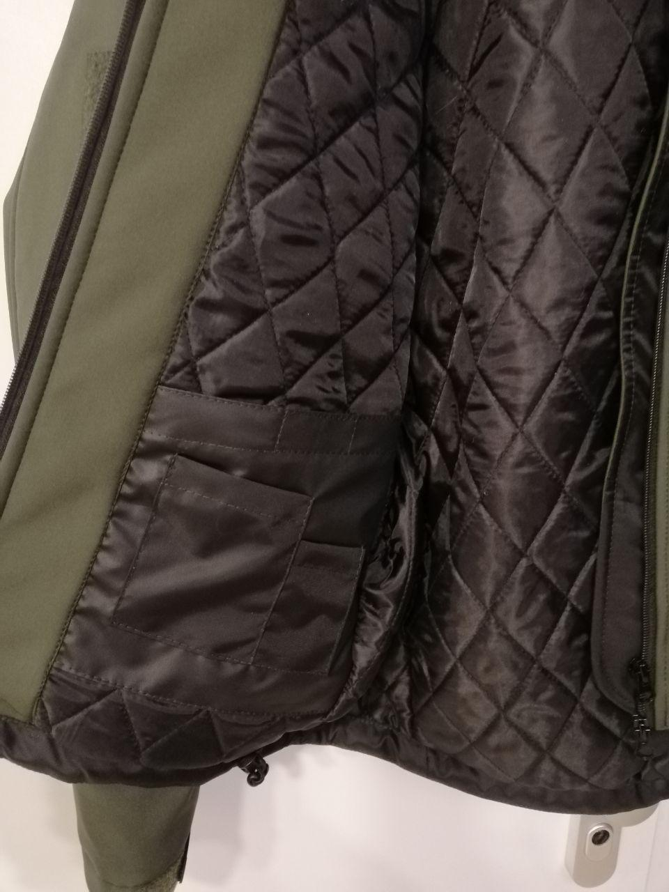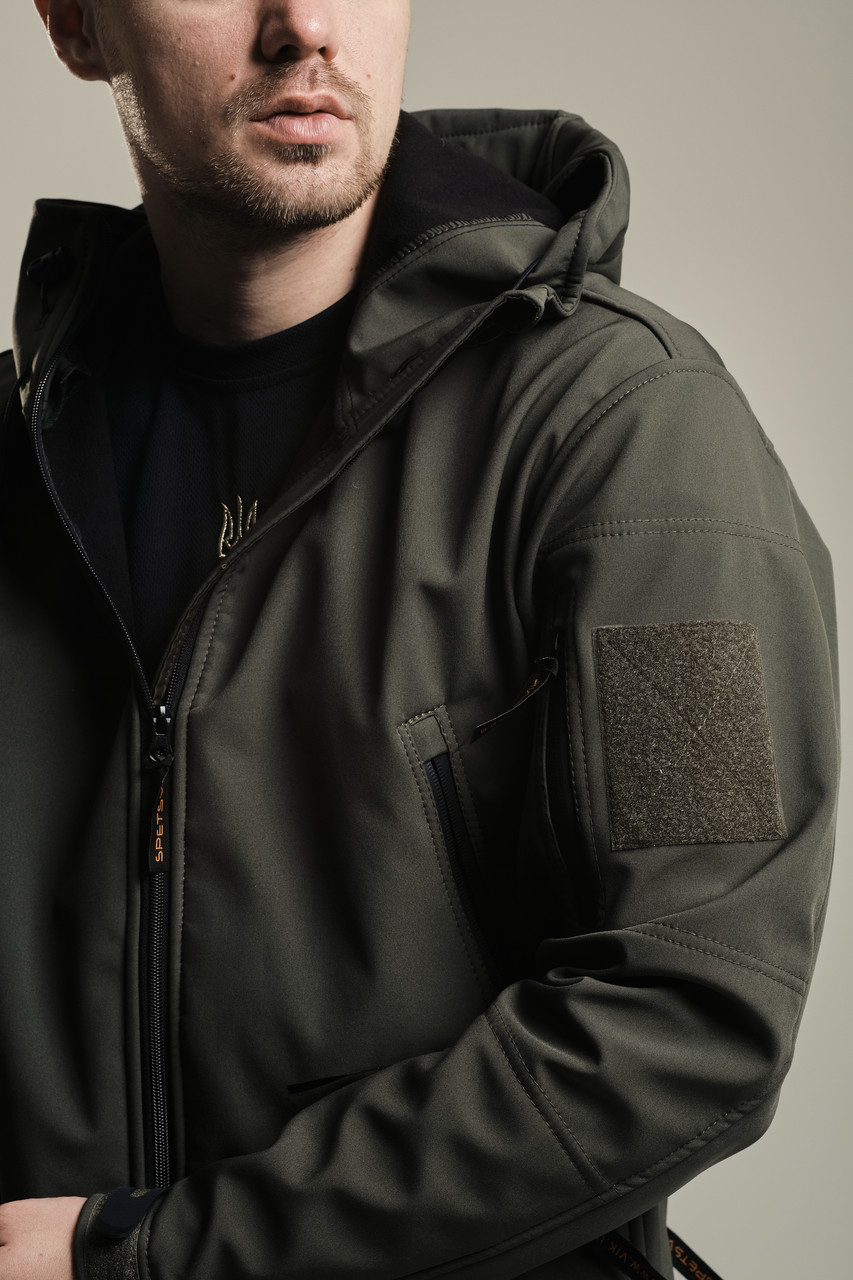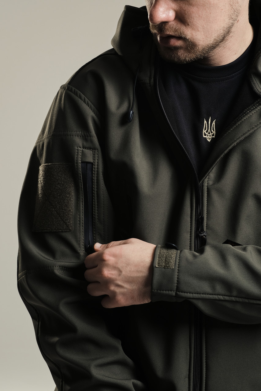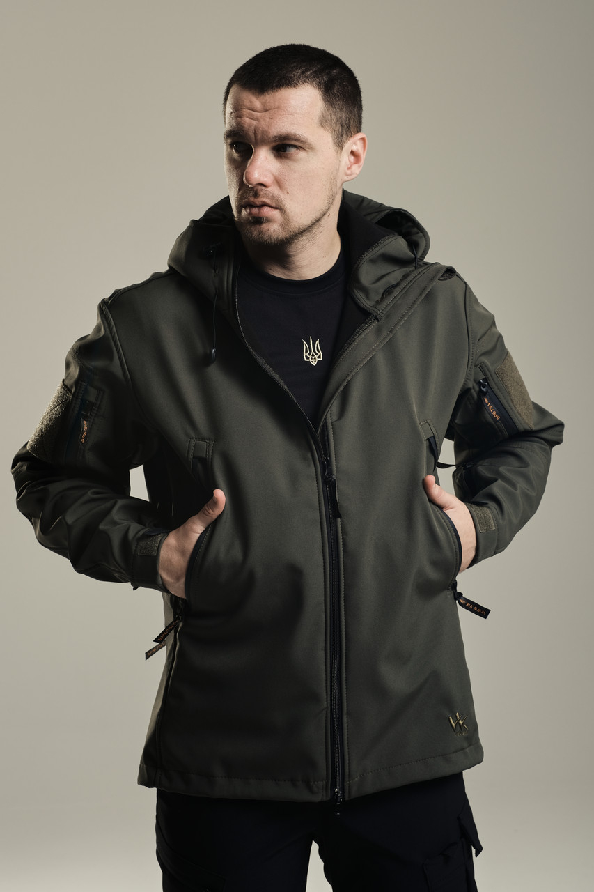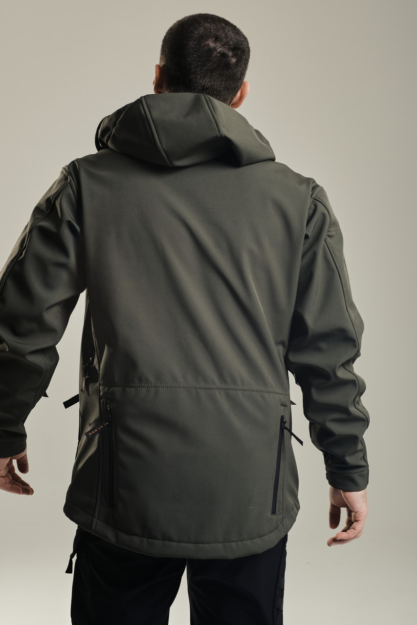 Тактична куртка-штормівка виготовлена зі щільної мембранної тканини Softshell . Куртка  УТЕПЛЕНА СТЕГАНОЮ ПІДКЛАДКОЮ НА СИНТЕПОНІ щільн.100 гм2  Завдяки властивостям матеріалу Софтшел виріб підходить для використання у вологих погодних умовах   у зимову пору року. Застібається на застібку-блискавку з 2 бігунками, утворюючи комір-стійку. Капюшон не відстібається. Його об'єм  регулюється за допомогою шнура та фіксаторів. У конструкції капюшона передбачений короткий козирьок. Капюшон також утеплений синтепоном. На передній частині розташовані вертикальні кишені на рівні грудей, утеплені флісом. Також кишені є на обох рукавах і на спинці куртки в поперековій зоні. Ширина рукава регулюється патою на липучці. На рукавах є панелі велкро для шевронів. Ширина куртки внизу регулюється за допомогою куліси.  На обох полицях куртки є  внутрішні кишені  для документів та інших дрібних речей.