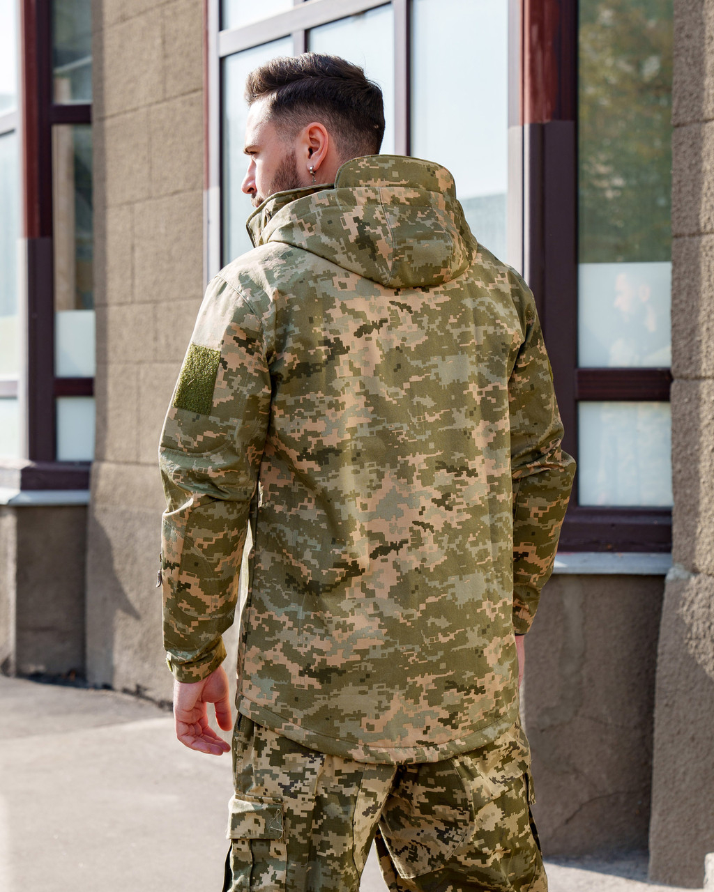 Куртка-вітровка виготовлена з міжшарової мембранної тканини Softshell, з флісом із внутрішнього боку, яка захищає від вологи, бруду,холоду та вітру. Особлива структура тканини замінює кілька шарів матеріалу, завдяки чому куртка дуже тепла та легка. Застібка — блискавка. Капюшон відстібається. Кишені: 1 нагрудний вертикальний прорізний на блискавці; два бічні нижні. і на обох рукавів, на змійці і з панеллю велкро.На ліктях посилені накладки. Манжет фіксується текстильною застібкою. Спинка трохи довша за полицю. Ширина куртки внизу регулюється за допомогою куліси.