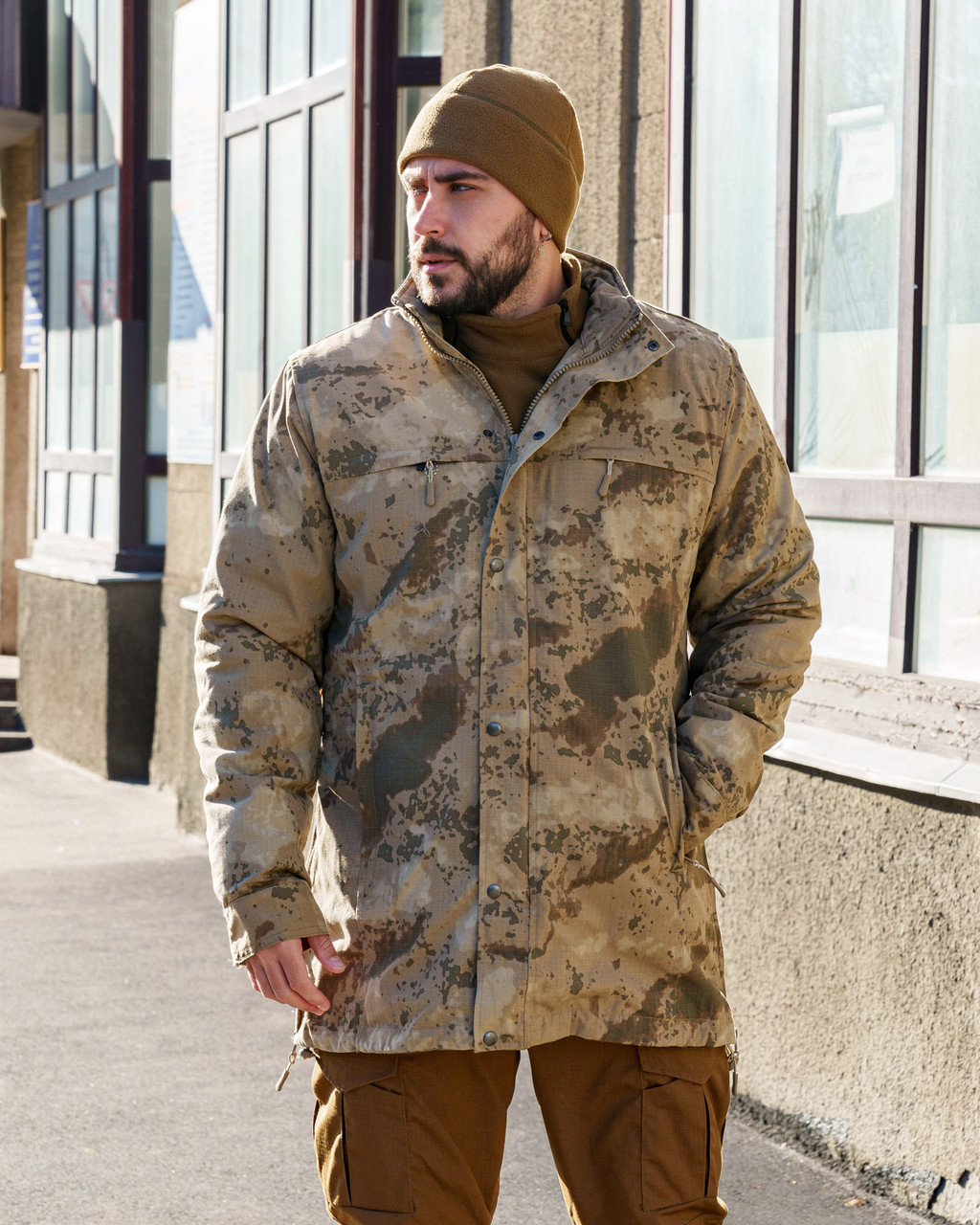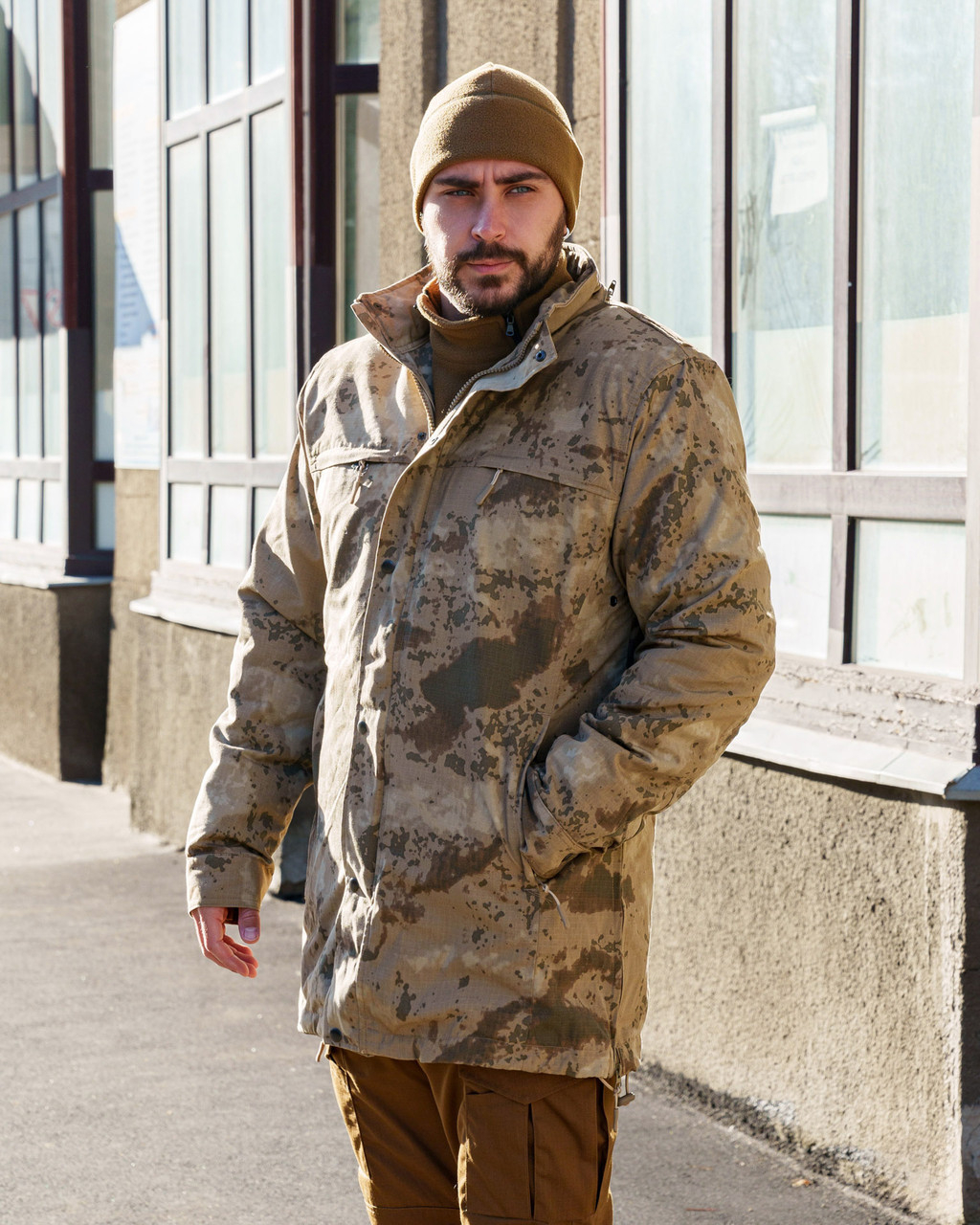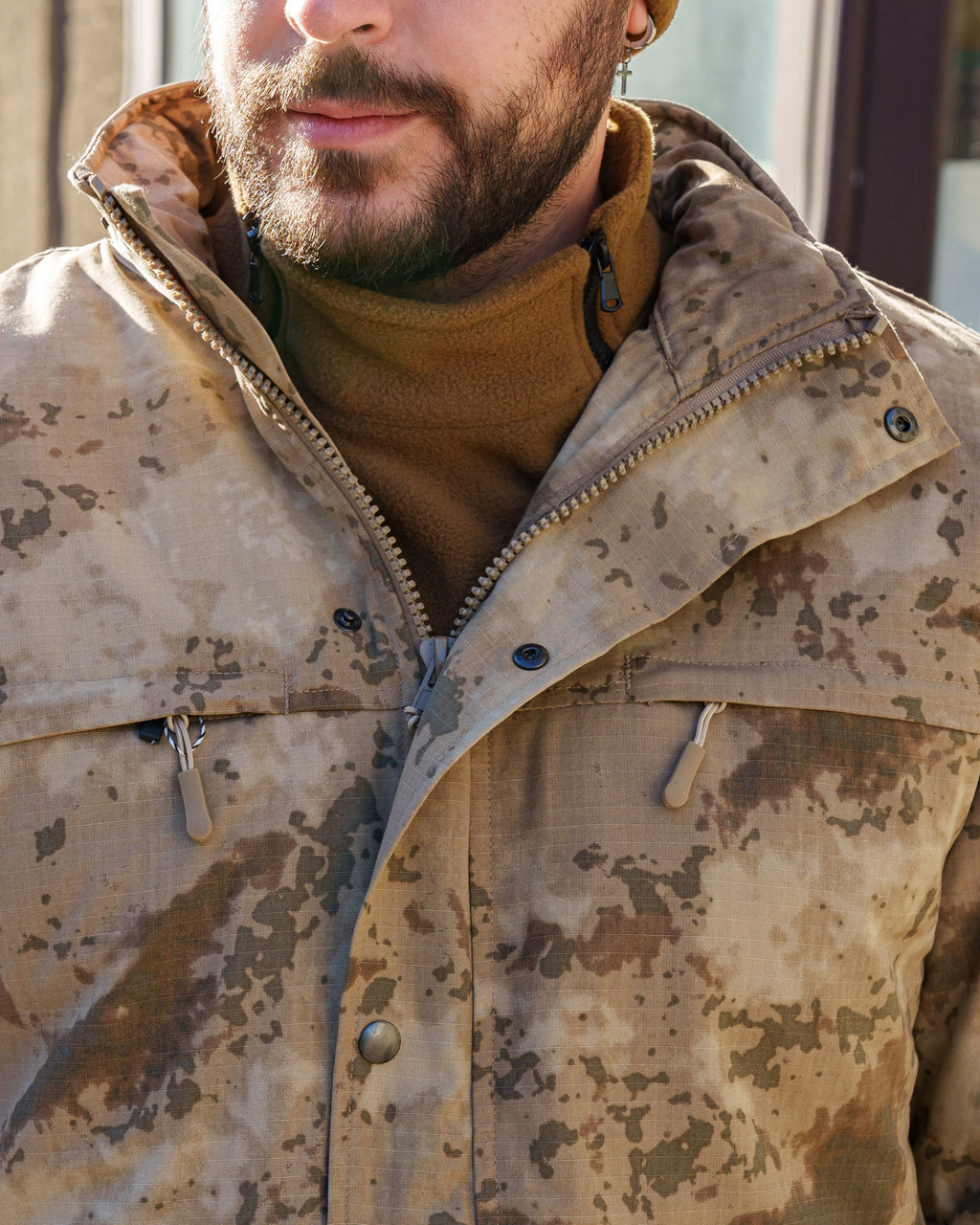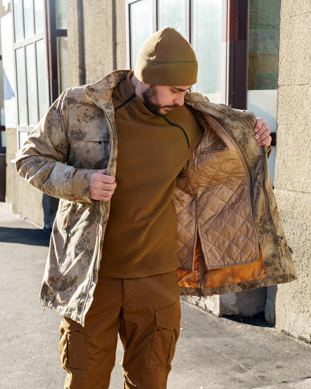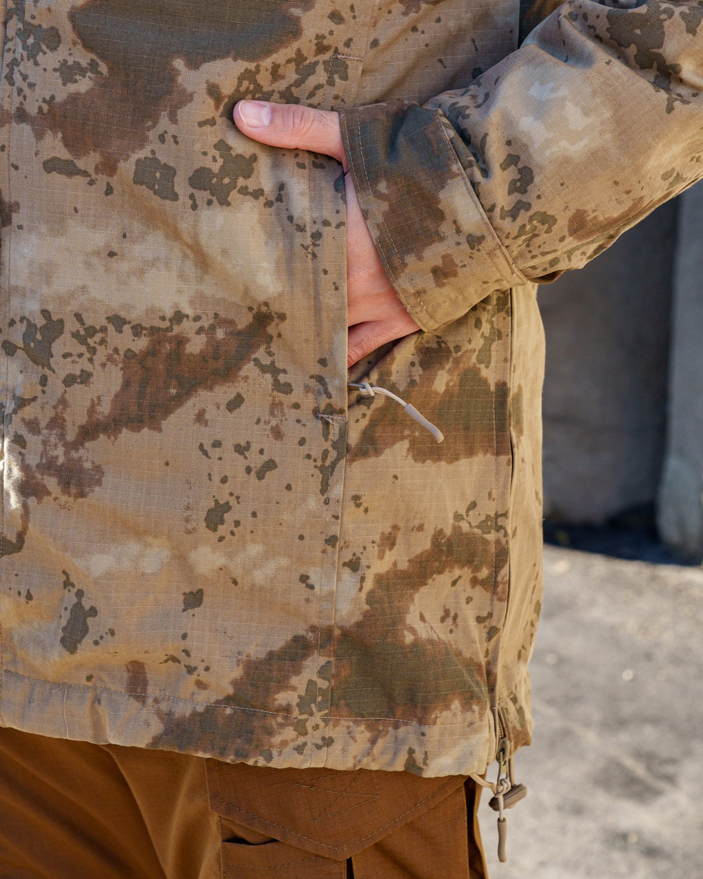 Тканина верху РІП-СТОП, міцна на розрив. Щільність 260 гм2, склад 65%пе/35%хб. Забарвлення — камуфляж, відтінок пісочний