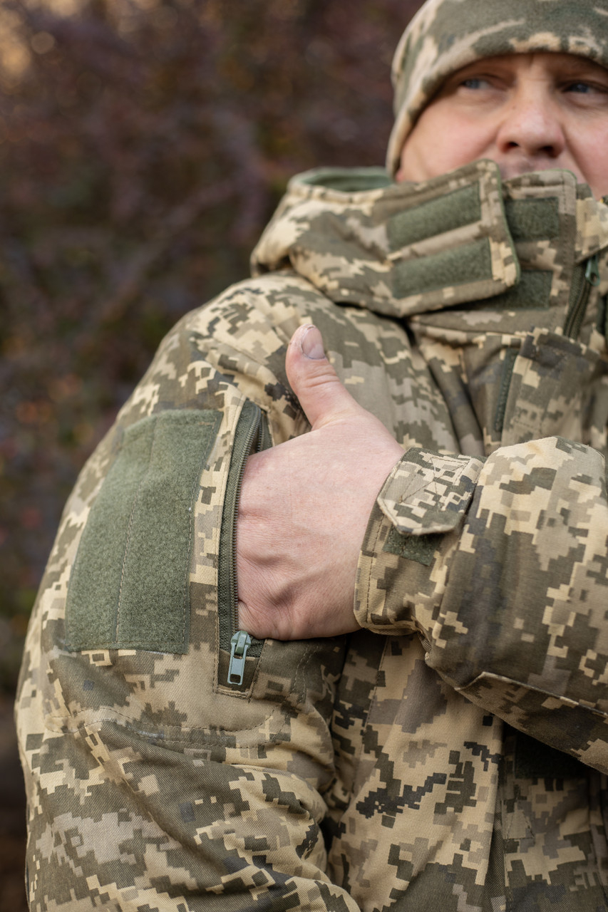 Куртка прямого крою, з подовженою спинкою. Рукави вшивні, з манжетом із регульованою шириною патою. Є вертикальні прорізні кишені на блискавці на грудях і рукавах. Панелі велкро на двох рукавах і грудях. Комір-стійка з флісом зсередини. Капюшон утеплений глибокий, у формі шолома, що відстібається,. На рукавах є підсилювальні накладки. Ширина куртки внизу регулюється куліскою Тканина верху: Ріп-Стоп ПІКСЕЛЬ 65хб/35пе, пл. 240 гм2, з нанесенням зі спіненого каучуку. Утеплювач: 2 шари шерстепону, пл. 200 гм2 ( термоефективніший, ніж синтепон, але водночас тонший і еластичніший), що робить виріб менш громіздким. Підкладка куртки фольгований OMNI-HEAT, зверху армований за допомогою звичайної поліестерної підкладки.