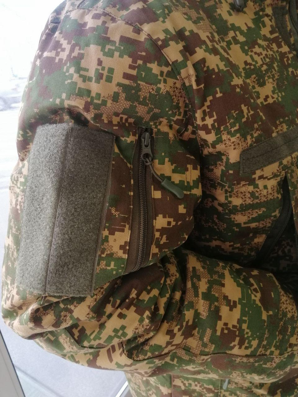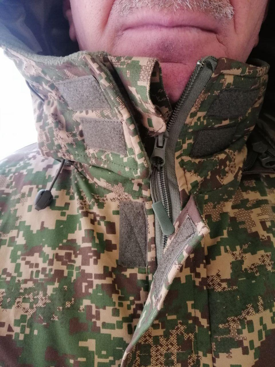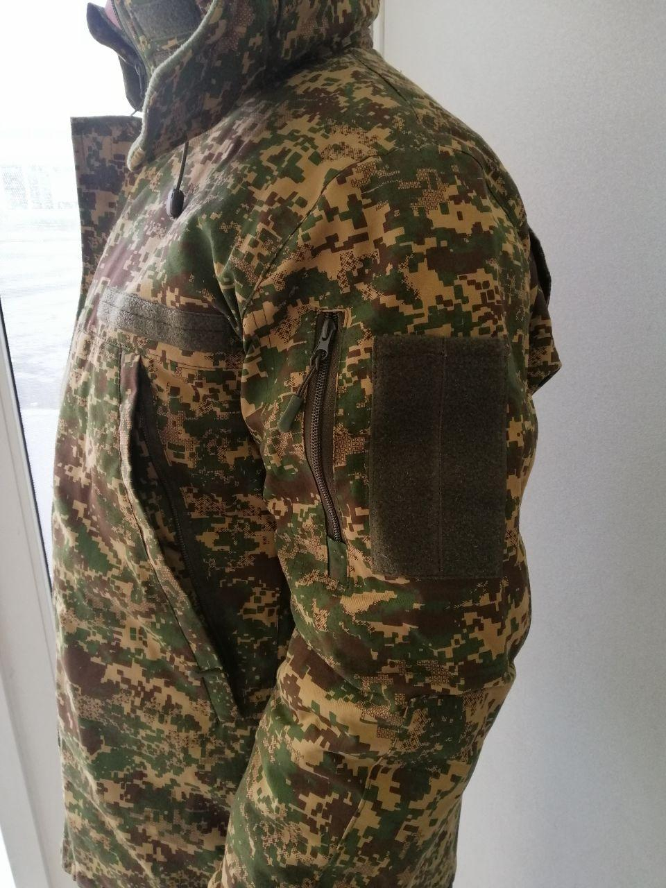 Куртка прямого крою, з подовженою спинкою. Рукави вшивні, з манжетом на гумці та з регульованою шириною патою. Є вертикальні прорізні кишені на блискавці на рівні грудей і рукавах. Панелі велкро на двох рукавах і грудях. Комір-стійка з флісом зсередини. Капюшон утеплений глибокий, у формі шолома, що відстібається,. На рукавах є підсилювальні накладки. Ширина куртки внизу регулюється куліскою Тканина верху: САРЖА 65хб/35пе, пл. 240 гм2, з водостійким просоченням. Утеплювач: 2 шари шерстепону, пл. 200 гм2 ( термоефективніший, ніж синтепон, але водночас тонший і еластичніший), що робить виріб менш громіздким. Підкладка куртки фольгований OMNI-HEAT, зверху армований за допомогою звичайної поліестерної підкладки.