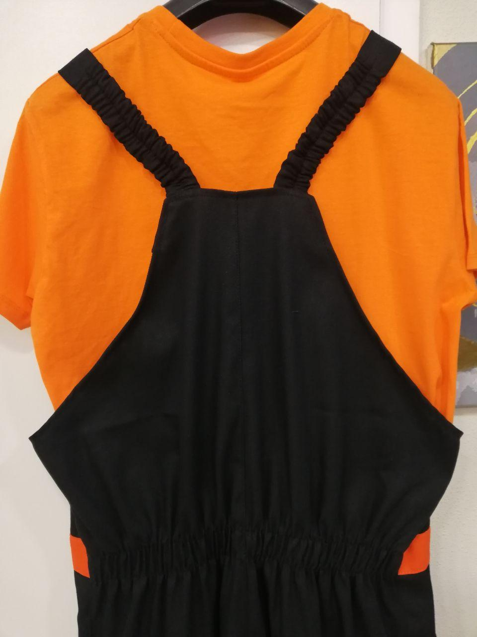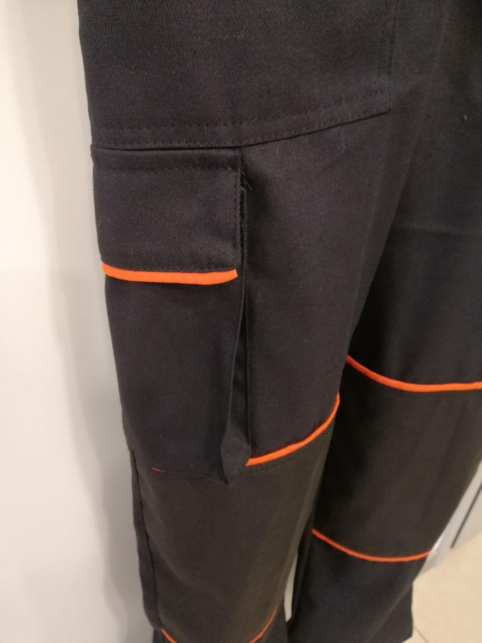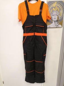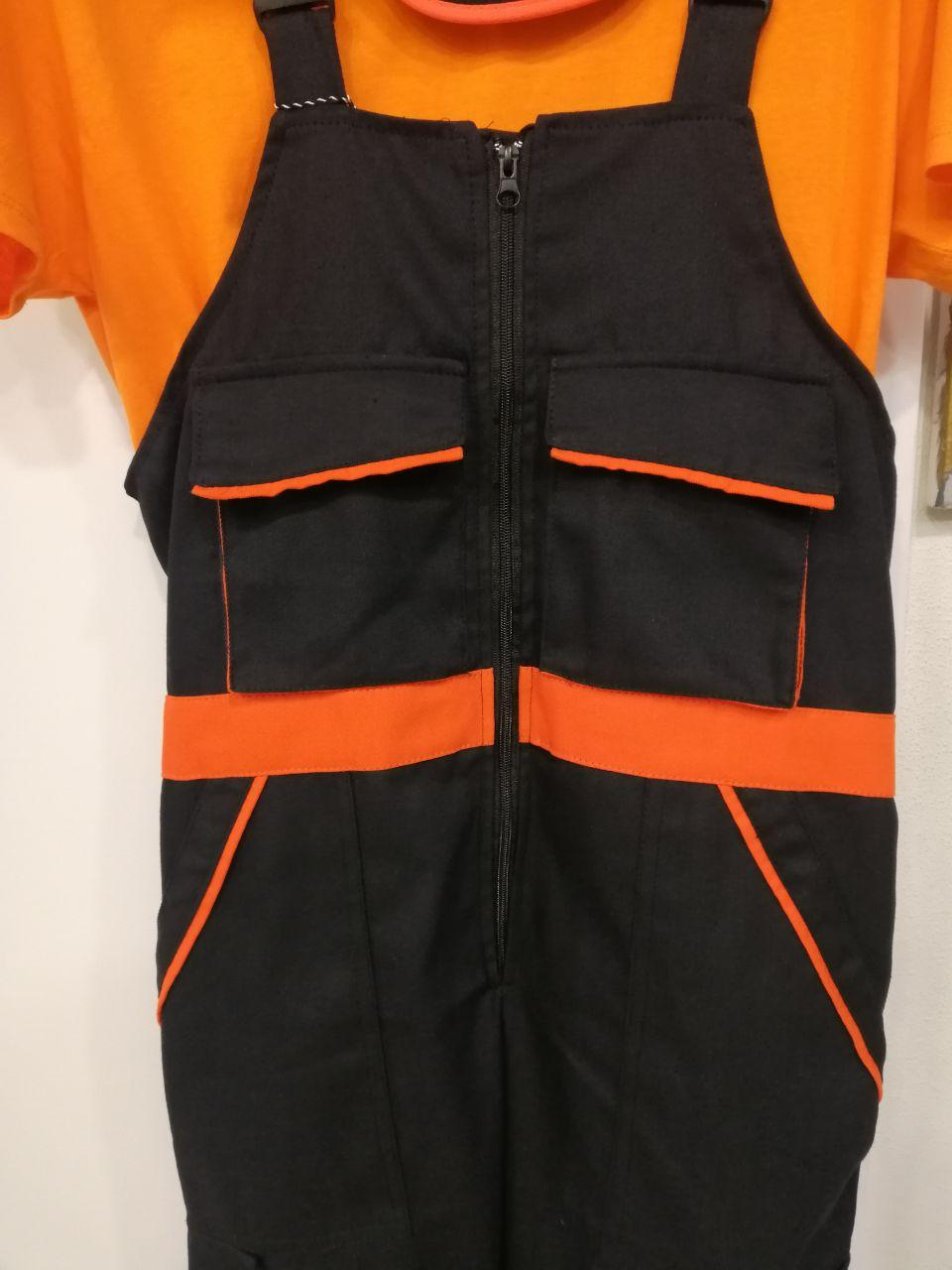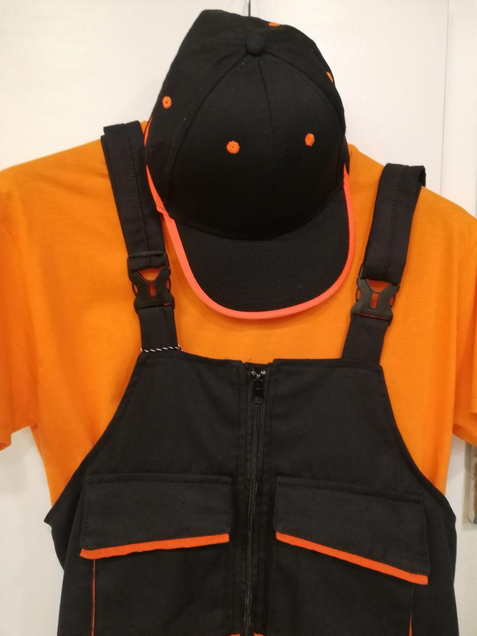 Напівкомбінезон робочий чоловічий для працівників будь-яких сфер виробництва, автосервісу, сільського господарства.  Комбінований: чорний із жовтогарячими   оздоблювальними елементами. Нагрудник напівкомбінезона на блискавці. Виріб має 6 кишень: дві нагрудні з клапанами на липучці, два внутрішні бічні й по одному об'ємному, з клапаном на липучці, з боків обох штанин.  Зона коліна посилена додатковою накладкою, обрамленою зверху та знизу контрастним кантом. Тканина : САРЖА  80%хб\20%пэ, плотн. 260 гм2.  Прекрасно  поєднується з жовтогарячою футболкою та кепкою в чорно-жовтогарячій колірній гамі.