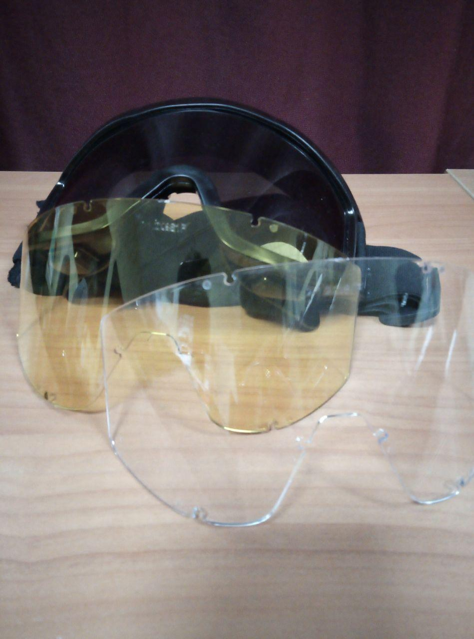 Окуляри - маска тактичні з 3-ма лінзами. Товщина лінзи 2 мм. Лінзи полікарбонат- темна, жовта, прозора. Ремішок на потилці.