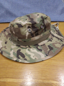 Панама з короткими крисами (шир. 6 см). За допомогою двох кнопок поля підіймаються вгору та кріпляться за типом сомбреро. Є стрічка для кріплення елементів маскування. Вентиляційні отвори. Шнур із фіксатором. Тканина РІП-СТОП, 280хб\20пэ. Забарвлення МУЛЬТИКАМ. Розміри 58-60.