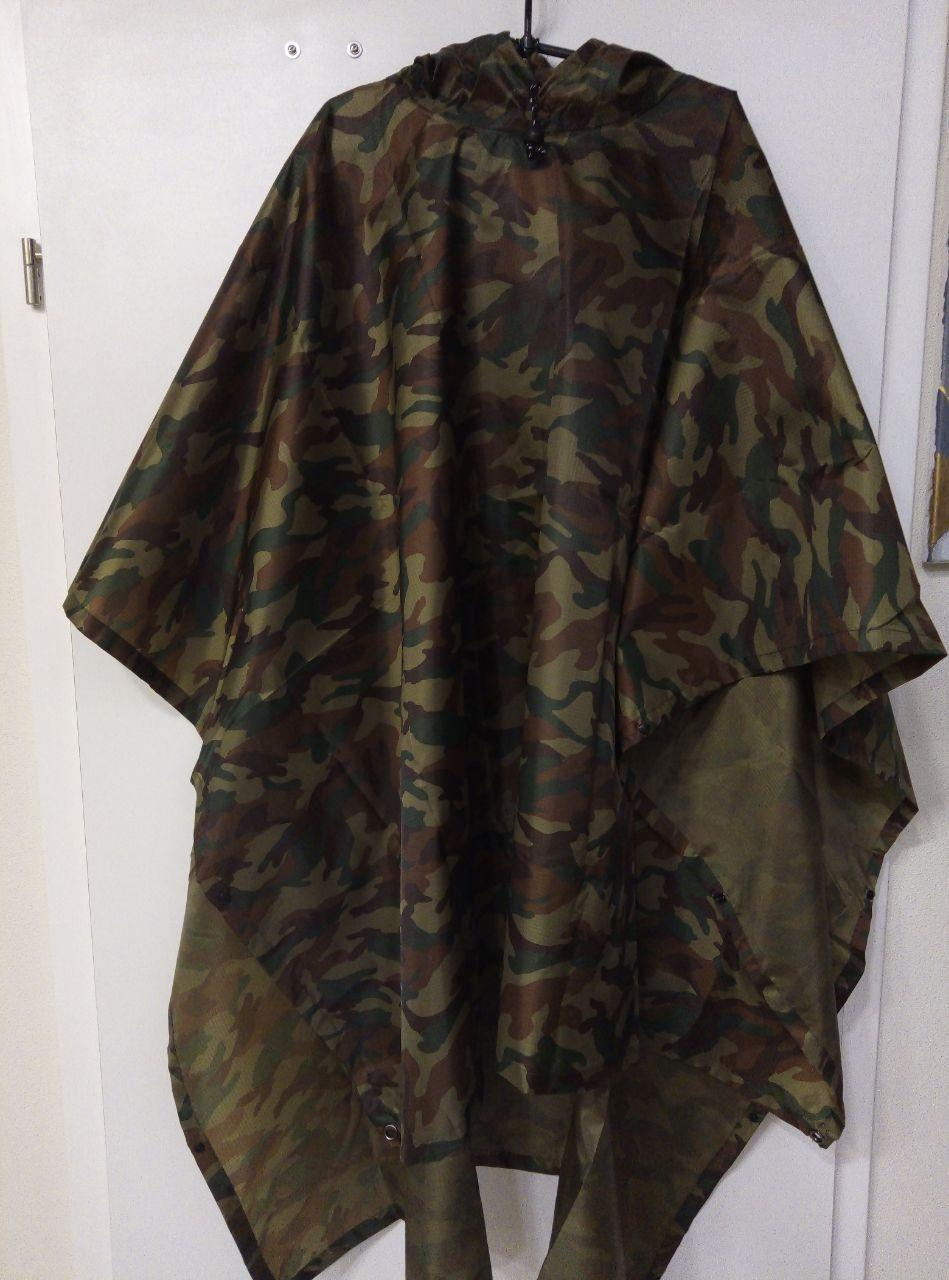 Накидка-пончо багатофункціонального використання. Виготовлений із тК.БОЛОНЬ РІП-СТОП, пл. 130 гм2, міцного на розрив, з водостійким просоченням. Надійно захищає від вітру та вологи. Має великий капюшон, що підходить для носіння на касці, з регулюванням. Розмір універсальний. З боків фіксується металевими кнопками. Зручний у зберіганні, сумка в комплекті.