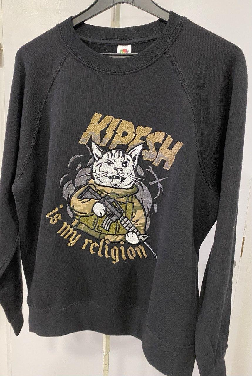 СВЕТР-РЕГЛАН чорного кольору ,склад 100% бав. На грудях методом вишивки нанесено малюнок бойового кота з написом KIPESH - is my religion