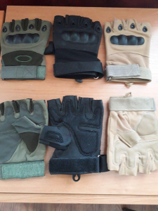 Рукавички без пальців тактичні. Колір : Олива,Койот, Чорний. Матеріал комбінований : мікрофібра, нейлон, поліестер. Гумовий захист пальців та суглобів. Пальці зі сотори долоні посилені додатковою антиковзаючою вставкою. Застібка з гарною фіксацією на запясті. Розмір Л.