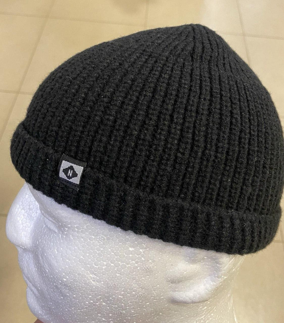 Шапка в,язана з малим підворотом. Матеріал - напіввовна . Посадка низька. Колір ЧОРНИЙ. Розмір універсальний (56-59). Висота виробу 16 см.