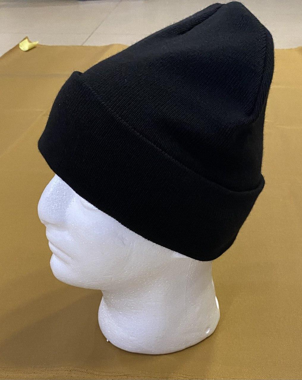 Шапка зимова, подвійного плетіння, з  підворотом. Матеріал - акрил. Підкладка з флісу на рівні лобу.  Колір ЧОРНИЙ.  Розмір універсальний. Висота виробу 21 см.
