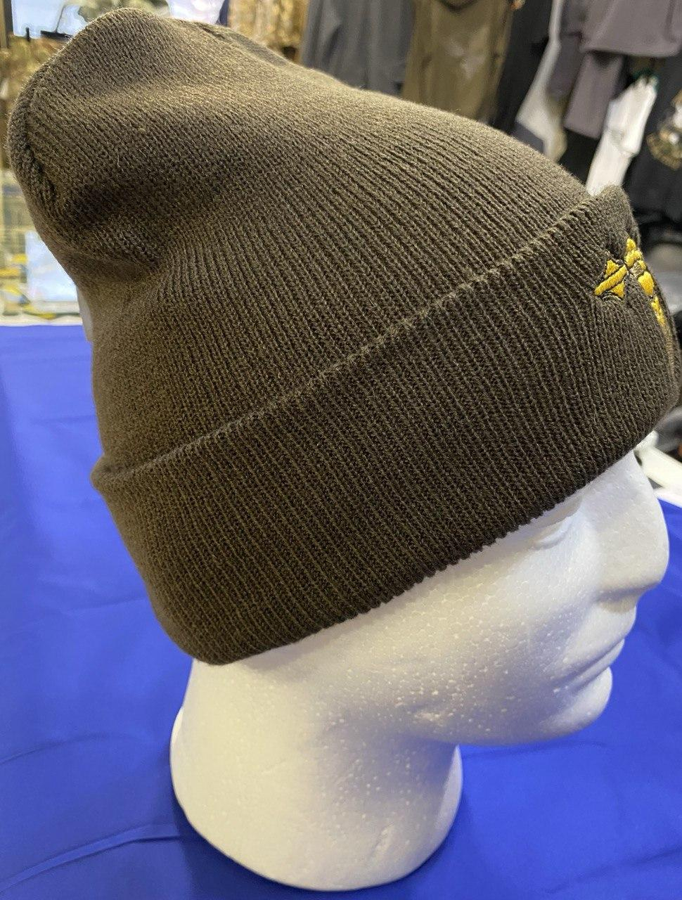 Шапка зимова, подвійне в'язання, з підворотом. Матеріал - акрил. Колір ОЛИВА Розмір універсальний.(56-60). По центру відворота розташована вишивка логотипу танкових військ ЗСУ - "ТРАКИ СИЛА"