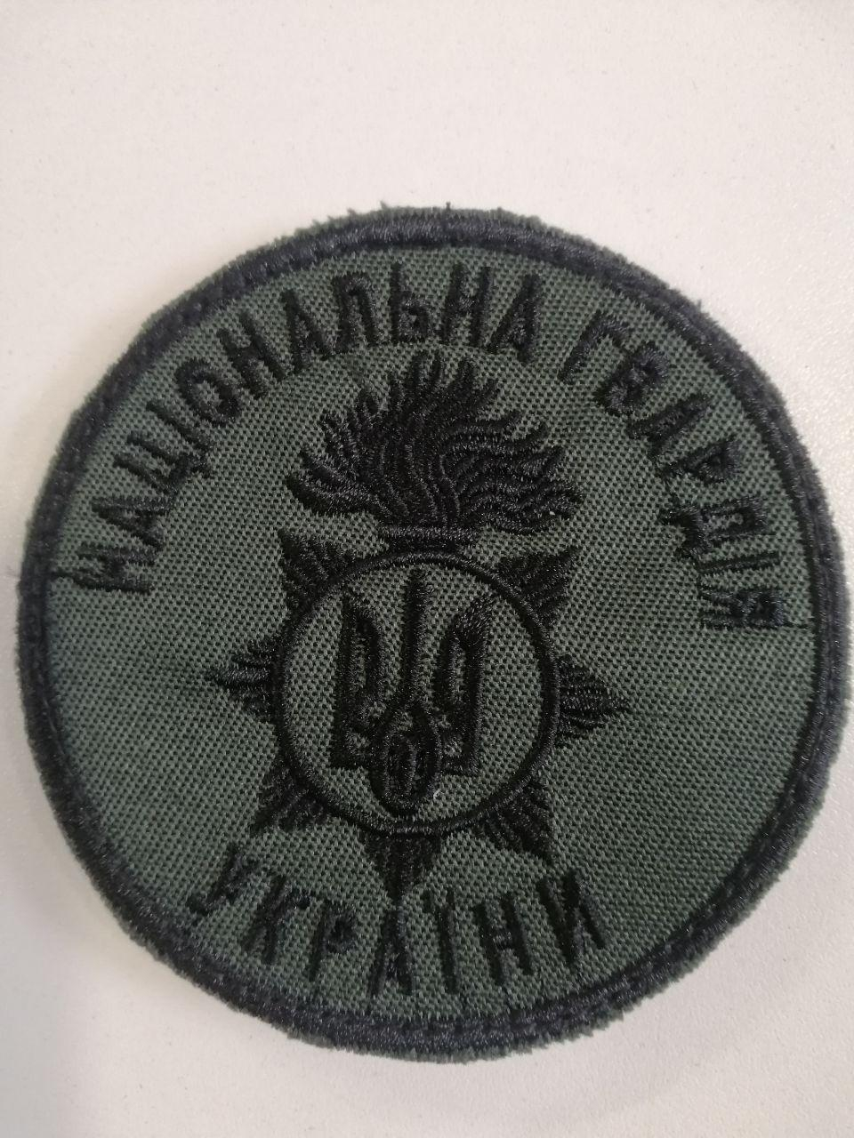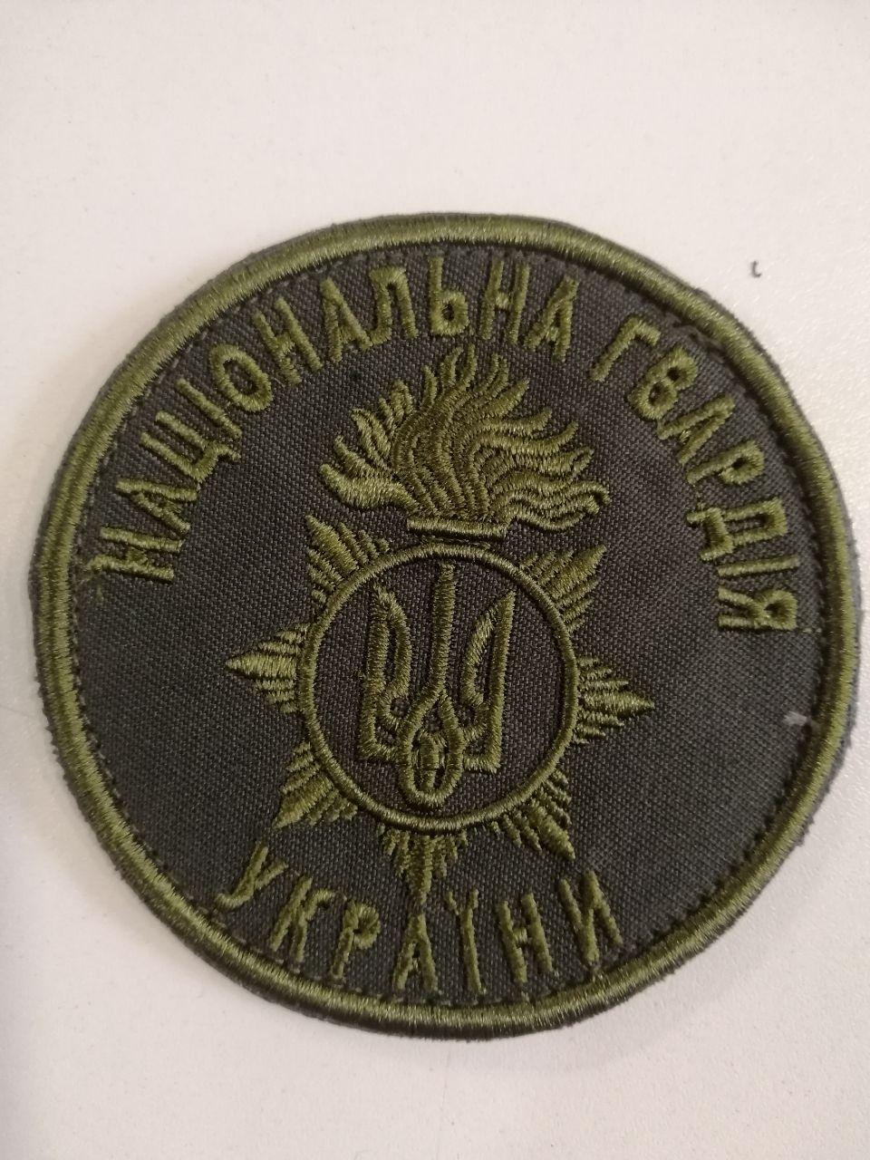 Шеврон круглий НАЦГВАРДІЇ України. Кріплення на липучці. Виконаний в двох кольорових варіантах. 1) Фон темна олива, вишивка чорна. 2) Фон хакі, вишивка світла олива.