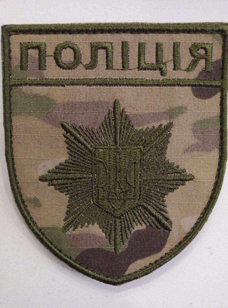 Шеврон нарукавний ПОЛІЦІЯ. Кріплення на липучці. Фон - мультікам. Розмір  9 х 7. 5 см