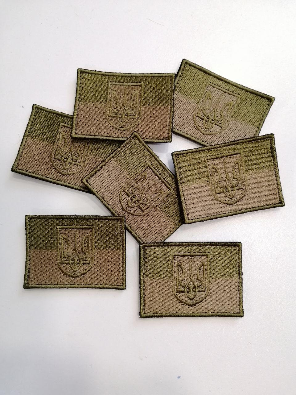 Шеврон ПРАПОР УКРАЇНИ з Тризубом. Польовий варіант. Кольори : олива+пісок. Кріплення на липучці.