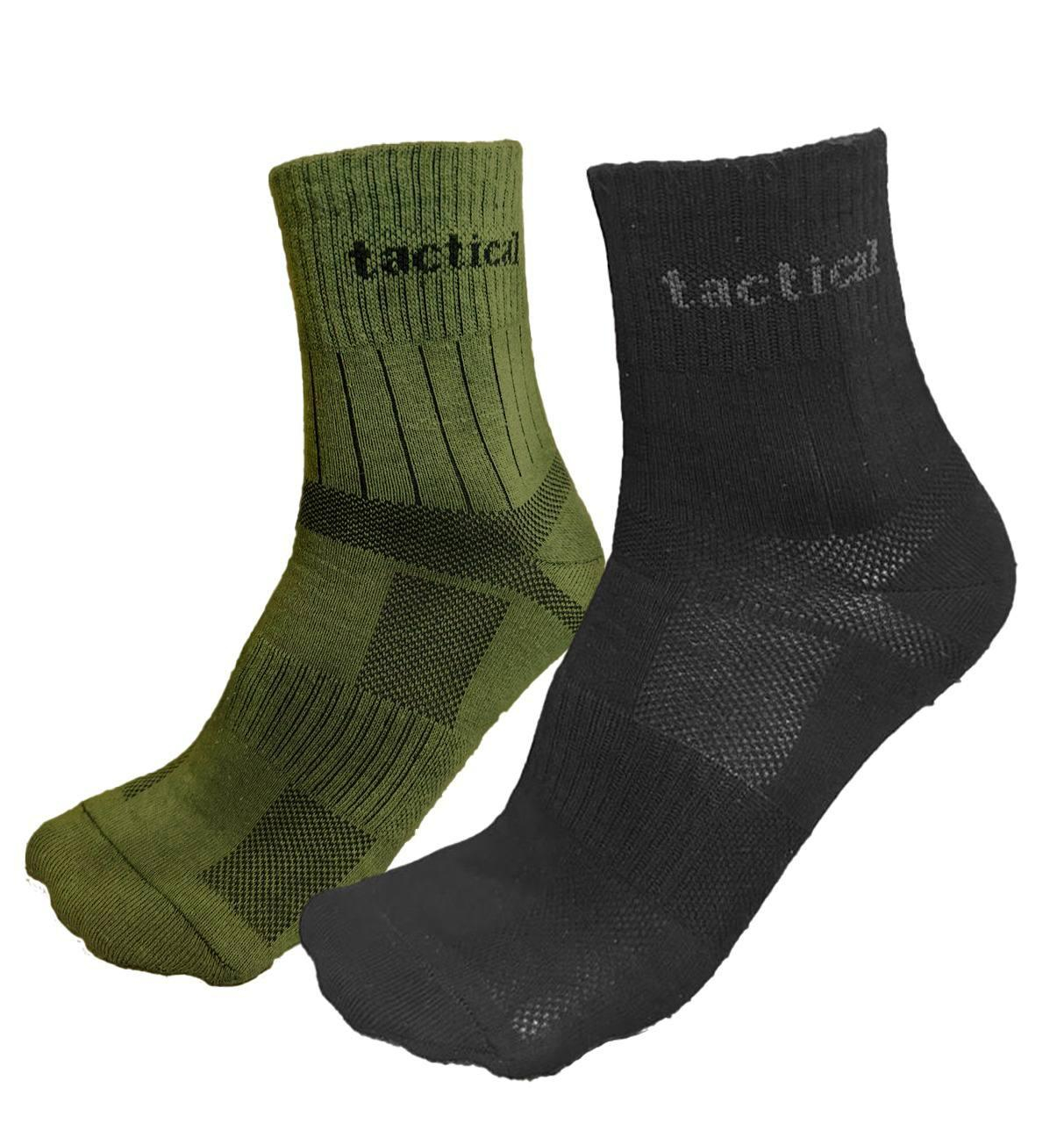 Тактичні армійські шкарпетки діють як захисний шар між шкірою ніг і взуттям, відводячи піт, зменшуючи тертя, і, як наслідок, оберігають від виникнення мозолів і водянок, а також бактерій завдяки антибактеріальним властивостям.Демісезонні шкарпетки виготовлені більшою частиною з бавовни, з додаванням поліестеру для більшої компресії відповідно до анатомічної особливості стопи. Склад: 85% бавовна/10% поліамід/5% поліестер.