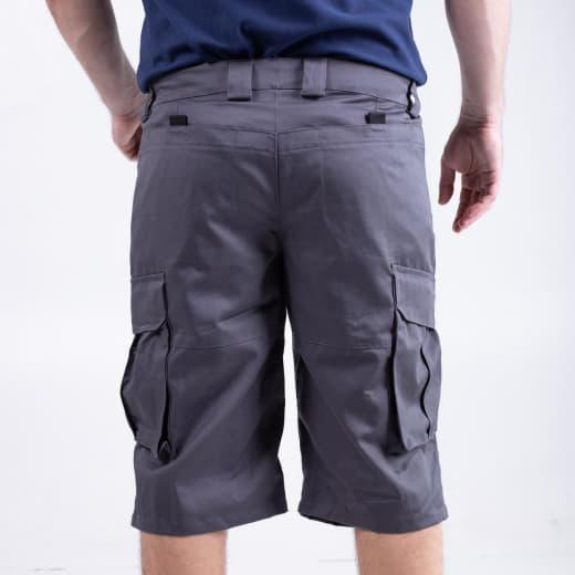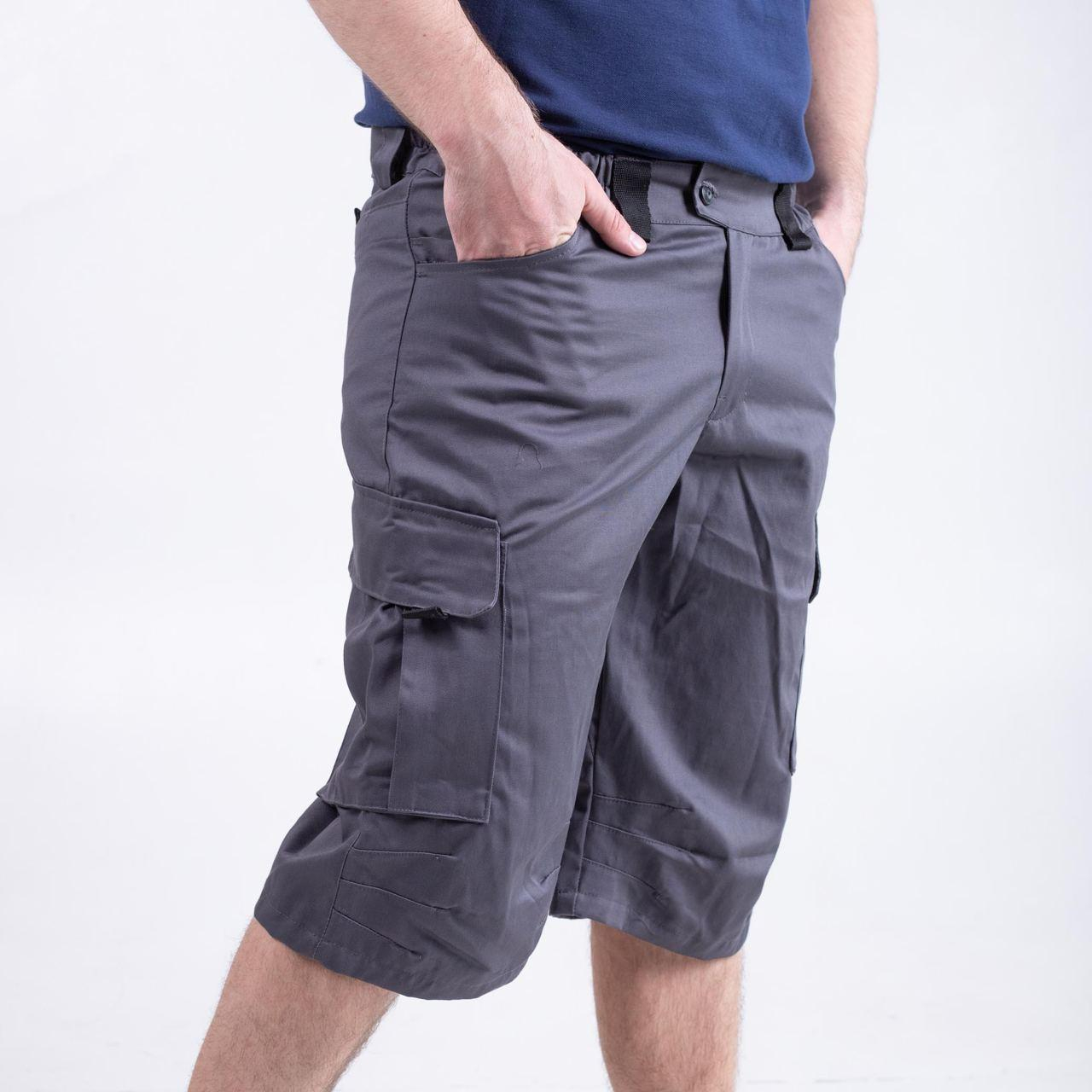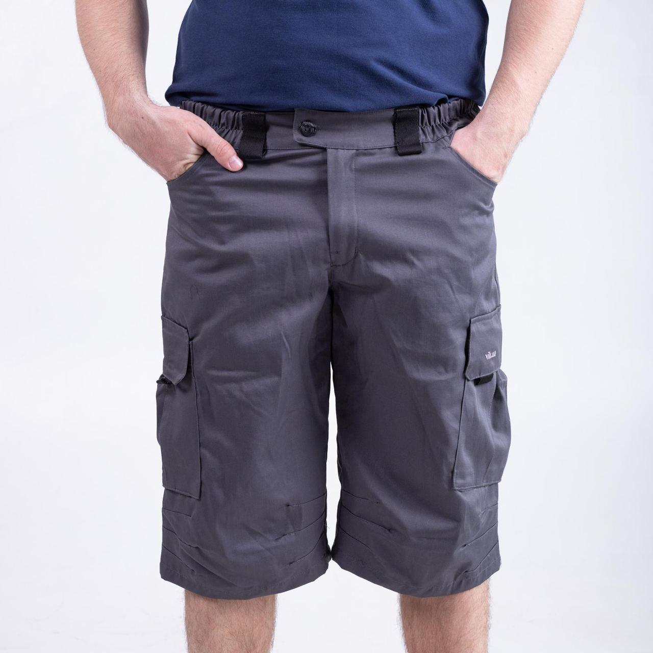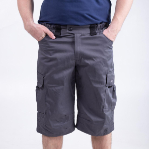 Зручні та функціональні шорти — ідеальний вибір для роботи та відпочинку.  Виконані в урбаністичній стилі. Є 6 кишень —  2 прорізні спереду, 2 потайні глибокі ззаду, і  2 накладных с клапанами на липучках по бокам брючин. Пояс частково на гумці. Довжина:  трохи нижче коліна. В зоні колінної чашечки є зборочки з двох боків, що створює об'єм для коліна, і не дає виробу витягатися в цій частині. Тканина САРЖА, склад 65пе/35 хб, щільний. 245 гм2.