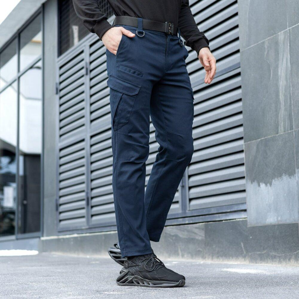Зручні та функціональні легкі  штани — ідеальний вибір на кожен день. Виготовлені в стилі Regular. Є 6 кишень —  прорізні:  ззаду та на правій штанині над основною кишенею, 2 внутрішні бічні  и  2 накладні з клапанами на липучках із боків штанин, на рівні стегон. Пояс штанів із петельками під ремінь і півкільцями.  З боків пояса вставлена гумка. Анатомічний крій колінної частини створює додаткову зручність у носінні й перешкоджає витягуванню тканини  і деформації форми виробу..  Тканина  КОТОН - "дихаюча"  , приємна в носінні, склад 95% бав/5%еластан . Колір  ТЕМНО-СИНИЙ.  Штани ідеально підійдуть для працівників різних силових структур, офісів, управлінь. Особливою популярністю користуються штани в працівників Української залізниці.